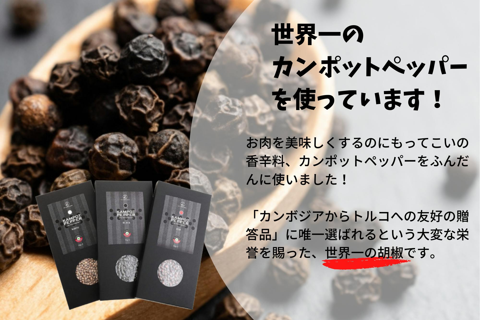 鳥取の企業RYU Trading Companyがカンボジアで栽培し、輸入&加工・販売を行っているカンポットペッパーを使用しています。このRYU Trading Companyのカンポットペッパーは、 数あるカンポットペッパーの中から「カンボジアからトルコへの友好の贈答品」に唯一選ばれた、世界一の胡椒なのです!