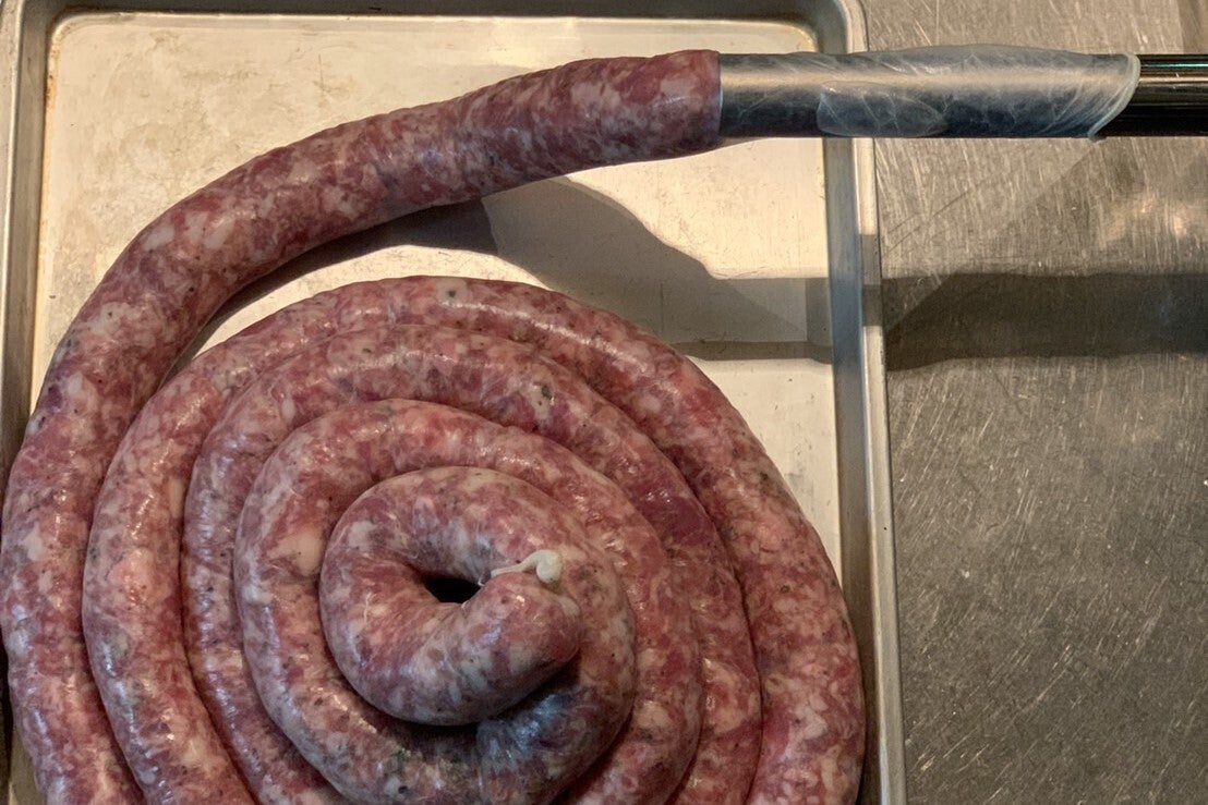 ソーセージを作る過程で一番大事なのが、生地を滑らかにし、プリンとした歯ごたえを生む、エマルジョン加工。ここでわざと一部にごろごろ感を残すことによって、豚肉の食感と肉汁のジューシーさがプラスされました!