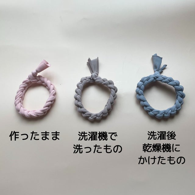 BiYOOONで作ったヘアゴムを洗ってみました。洗濯後も伸び縮みせずに使えます。乾燥機は素材劣化につながるので控えてください。洗濯機・手洗いの後、自然乾燥を推奨します。 ※実験で乾燥機にかけました。