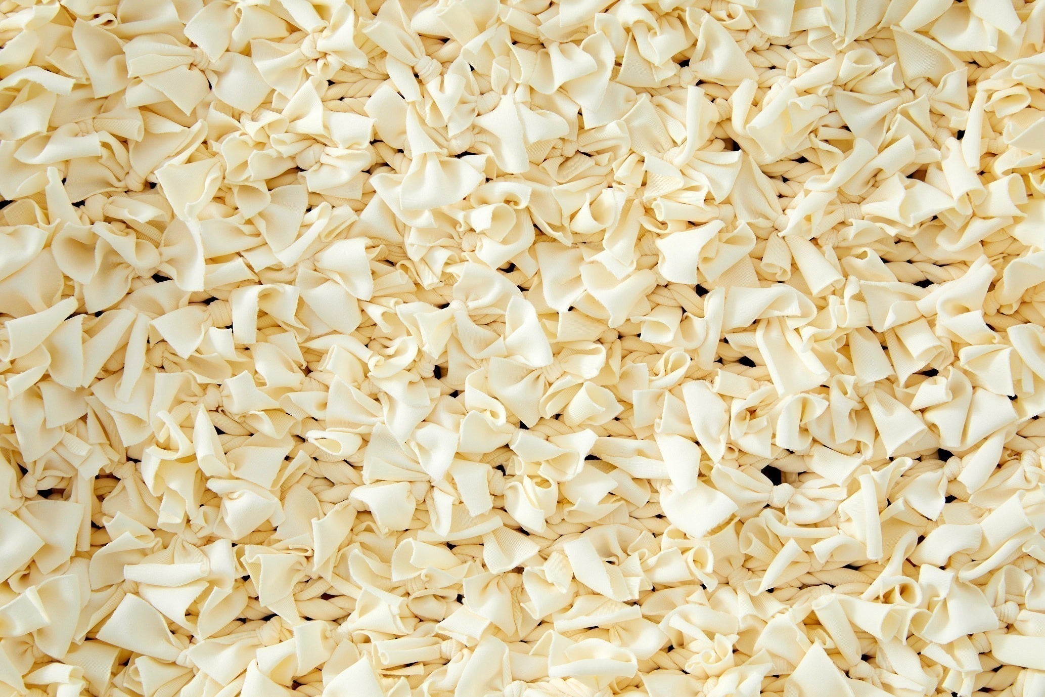 残布を繋いでいるため、つなぎ目が1玉につき2-6か所あります。編む以外にも、写真のような結んで作るタイプのDIYでは、この結び目を活かしたデザインも素敵です。