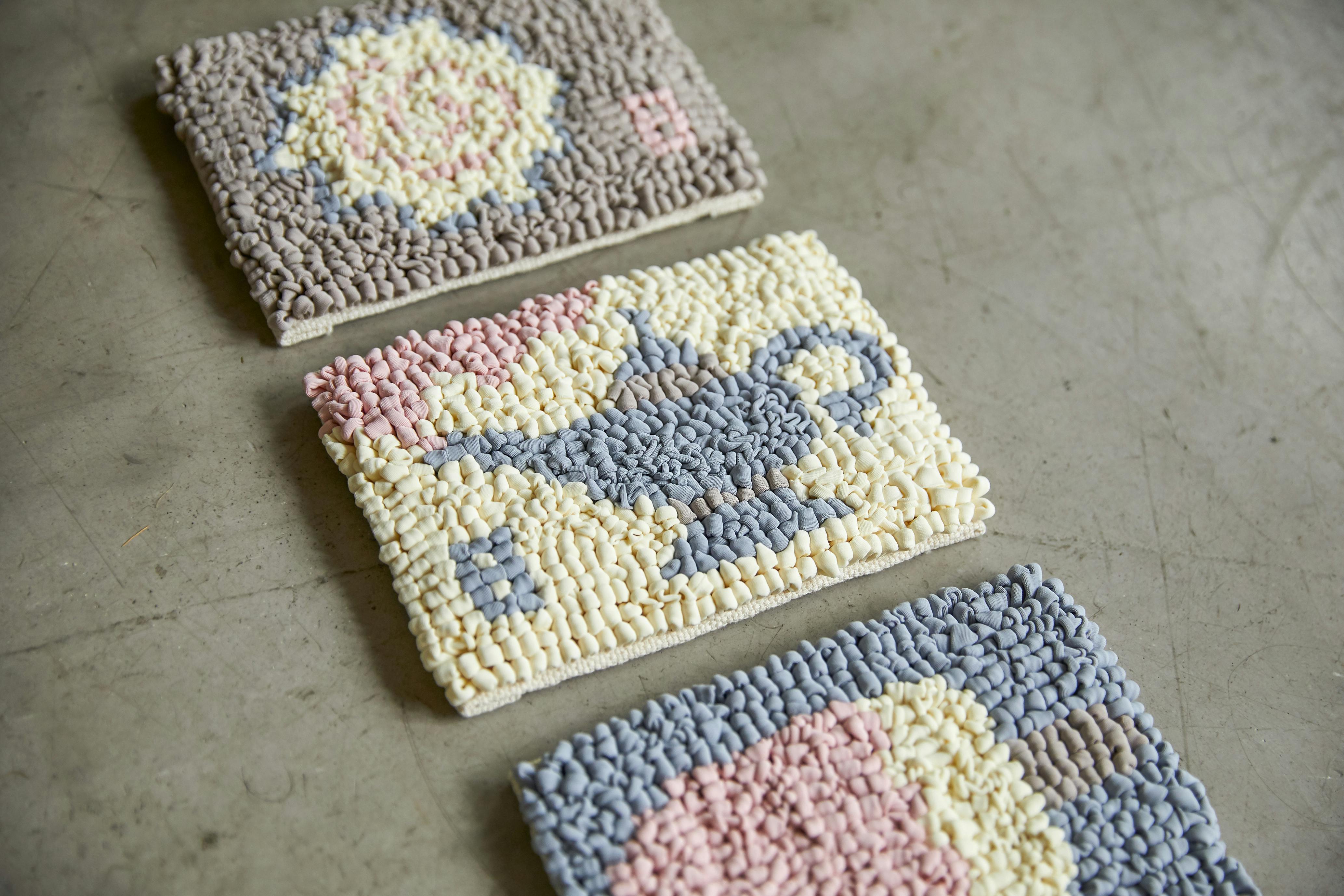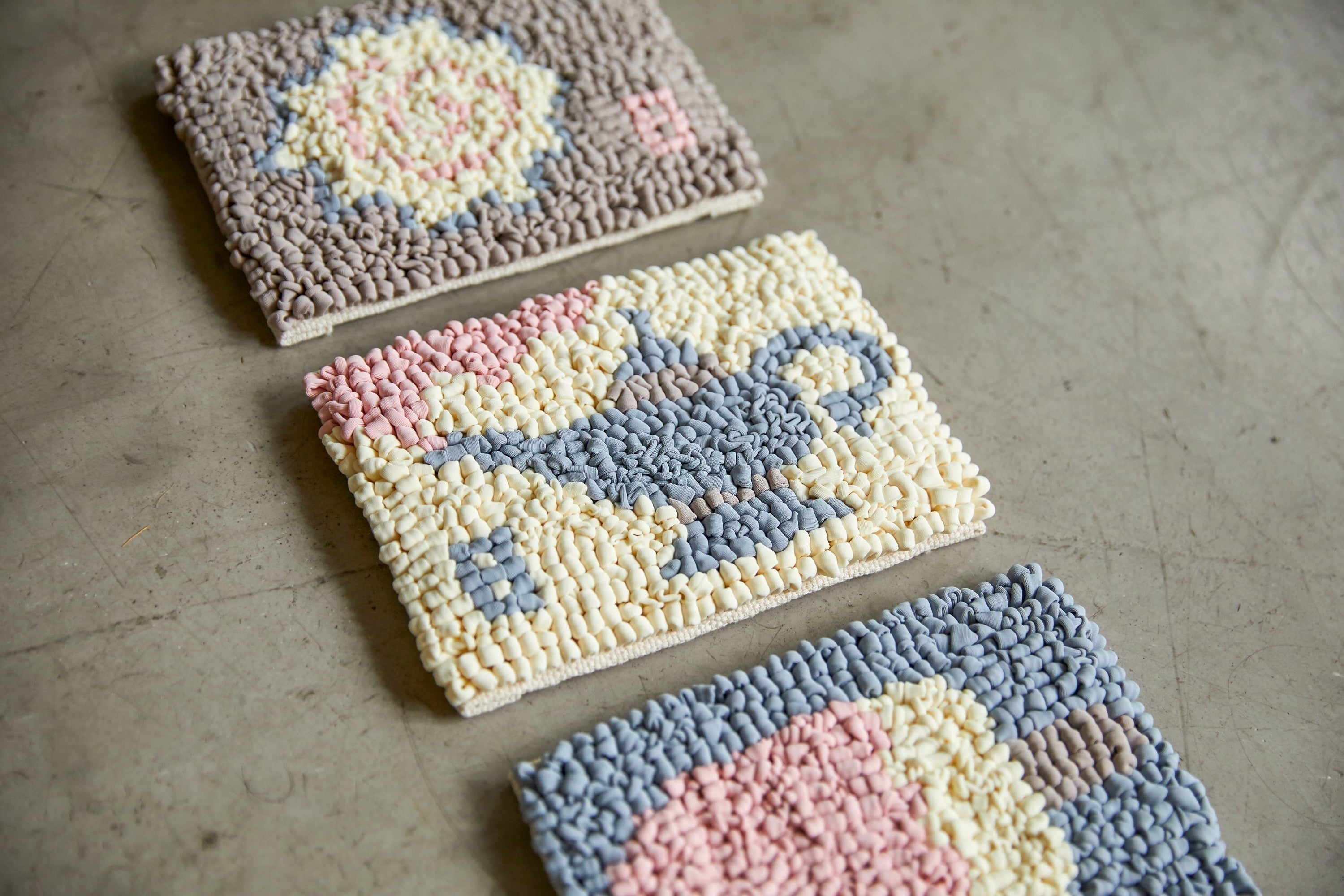 異素材とMIXしたり、BiYOOONに何か通す事でニュアンスを加える事もできます。下記はマクラメ糸で作ったタペストリーのアクセントとしてBiYOOONのベージュを一部で使った例です。