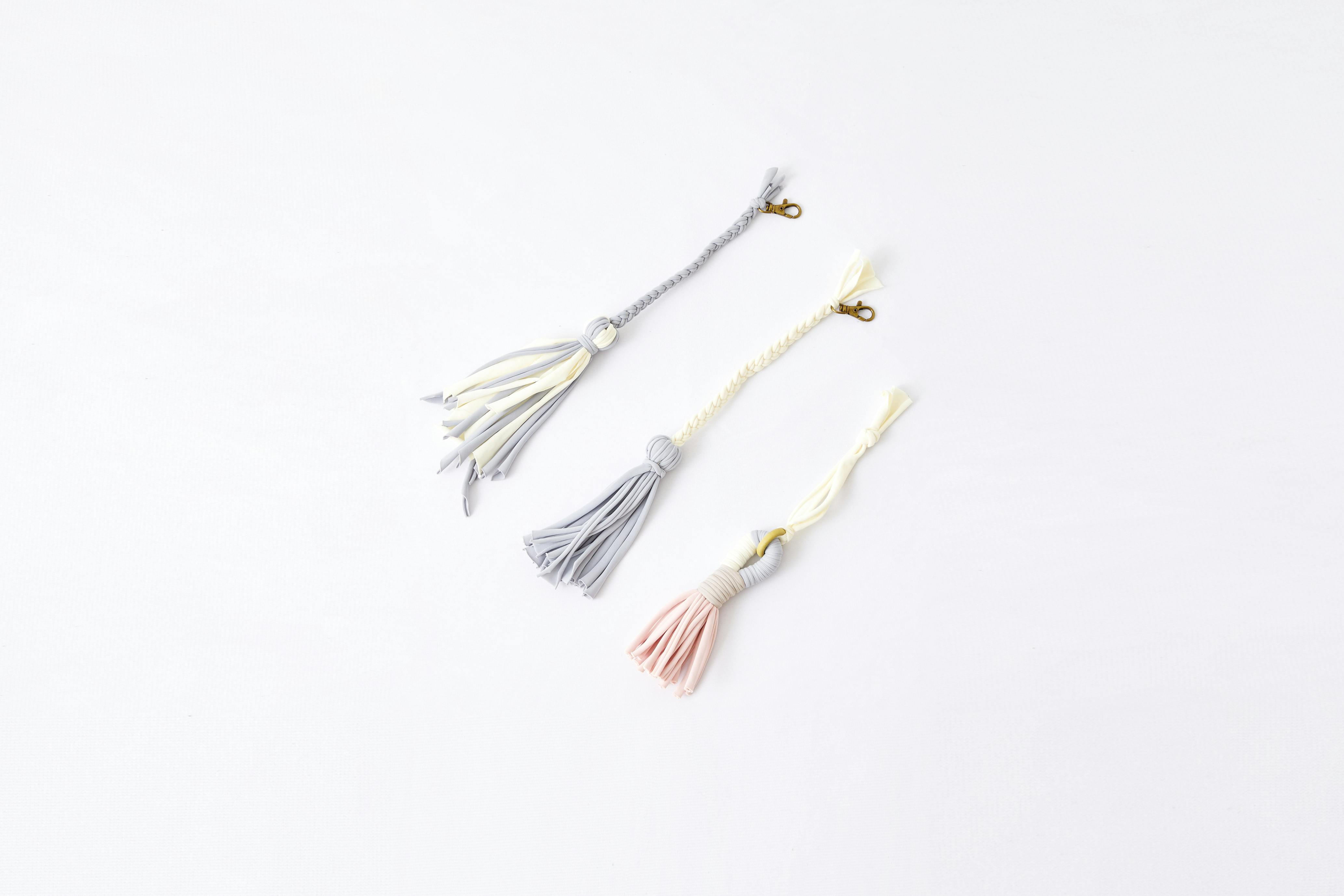 切りっぱなしでもほつれない為、タッセルも切って巻くだけ!それに紐をつけてキャットトイにもなります。従来のTシャツヤーンに比べ、糸くずも出にくい点が特徴です。