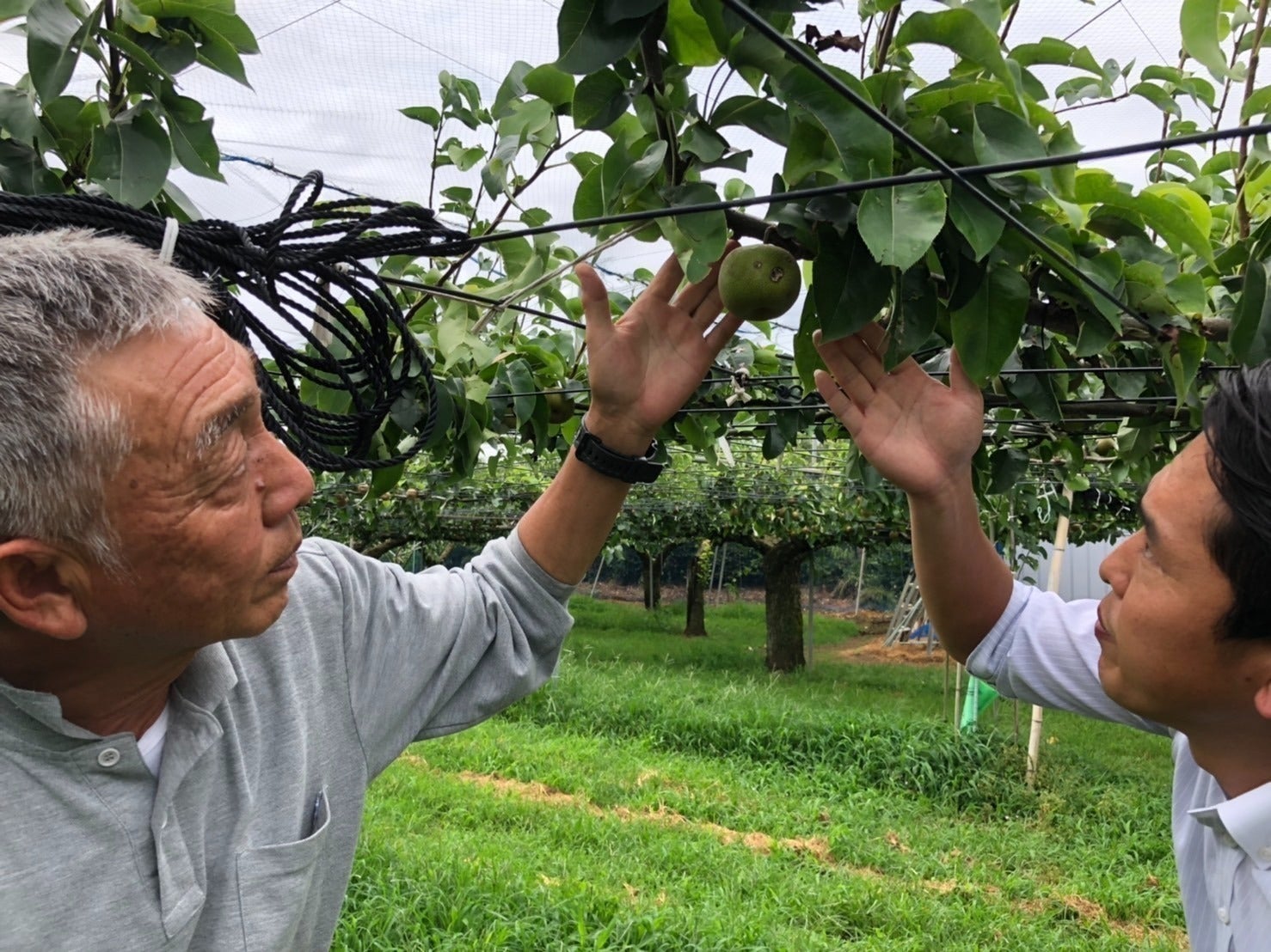 柏井地区の柏井梨業組合の部会長である染谷さん(左)