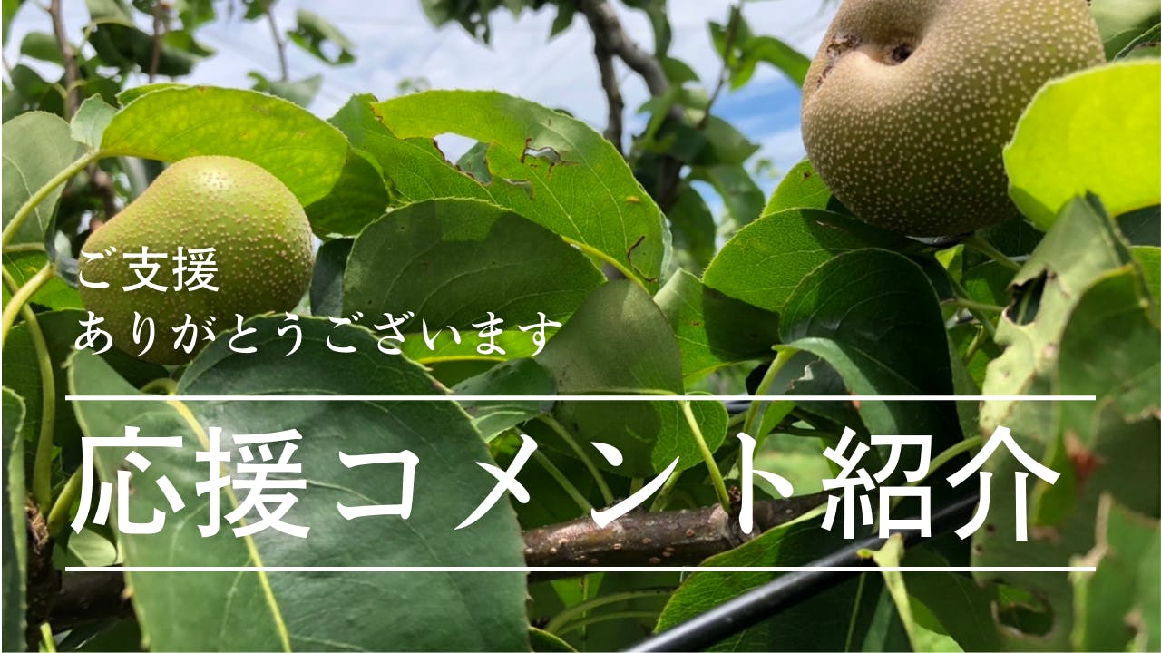 『梨ではありませんが、実家が果樹園をしていました。大雨で崩れた段々畑を前に立ち尽くしたことがあります。自然災害は自分たちの努力ではどうすることもできず悔しいですね。微力ですが応援しています。どうか頑張ってください。』
