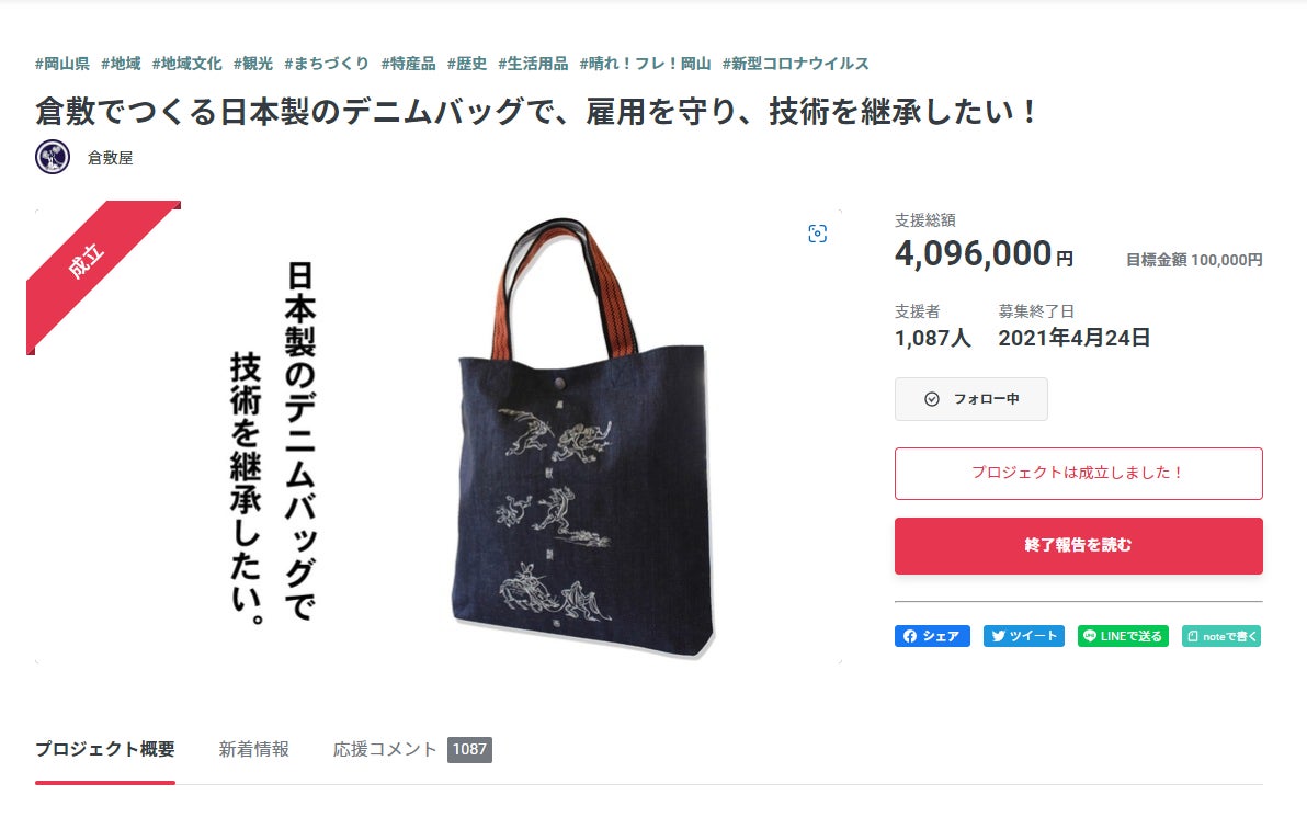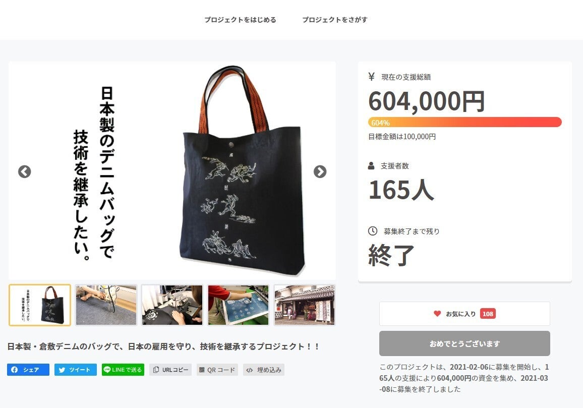 デニムバッグのリターン制作費及び、配送時の送料、技術の継承