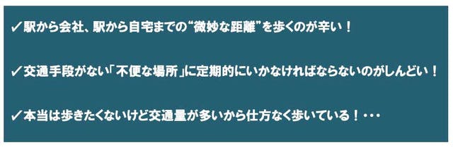 普段外出することが多いあなたにはこんな「お悩み」がありませんか?“車を使うまではいかないけど歩くには気が重い「微妙な距離」を通らなければならない!”