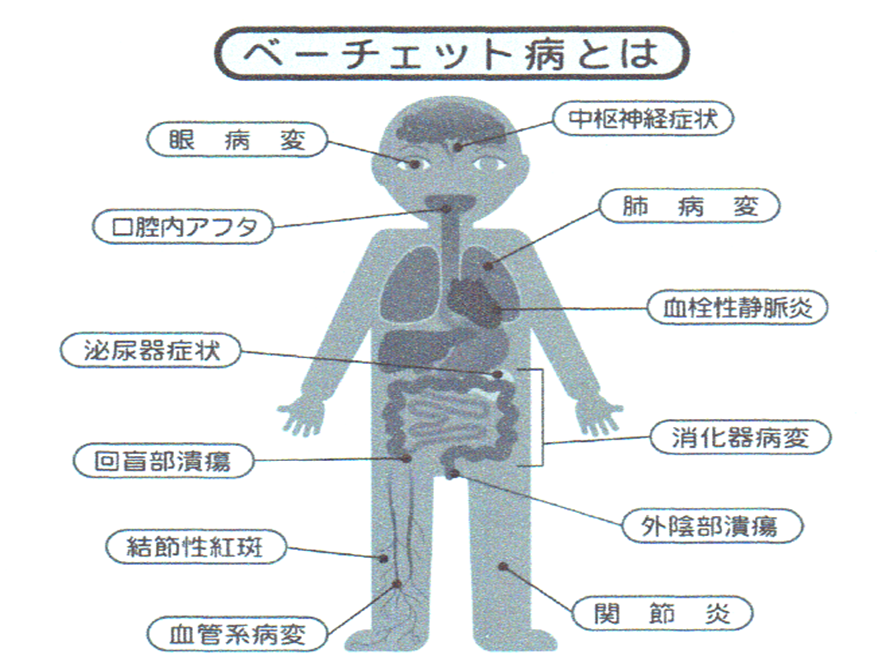 ベーチェット病(Behcet‘s disease)とは口腔粘膜のアフタ性潰瘍、外陰部潰瘍、皮膚症状、眼症状の4つの症状を主症状とする慢性再発性の全身性炎症性疾患です。