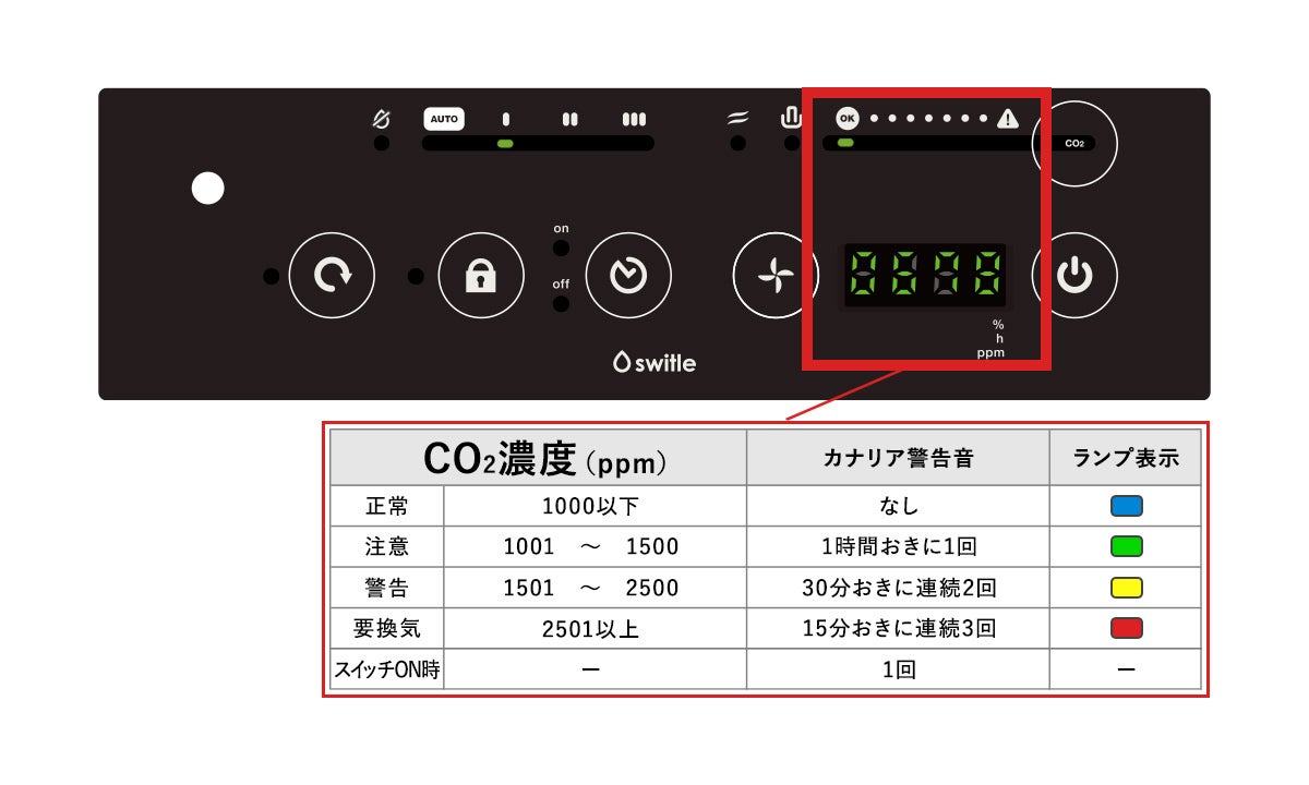 CO2濃度を換気の目安として、換気のタイミングを知ることができれば、最適な頻度でお部屋の空気質を改善することができると考え、次亜塩素酸 気化式加湿器switle(スイトル)にはCO2センサーを搭載しております。