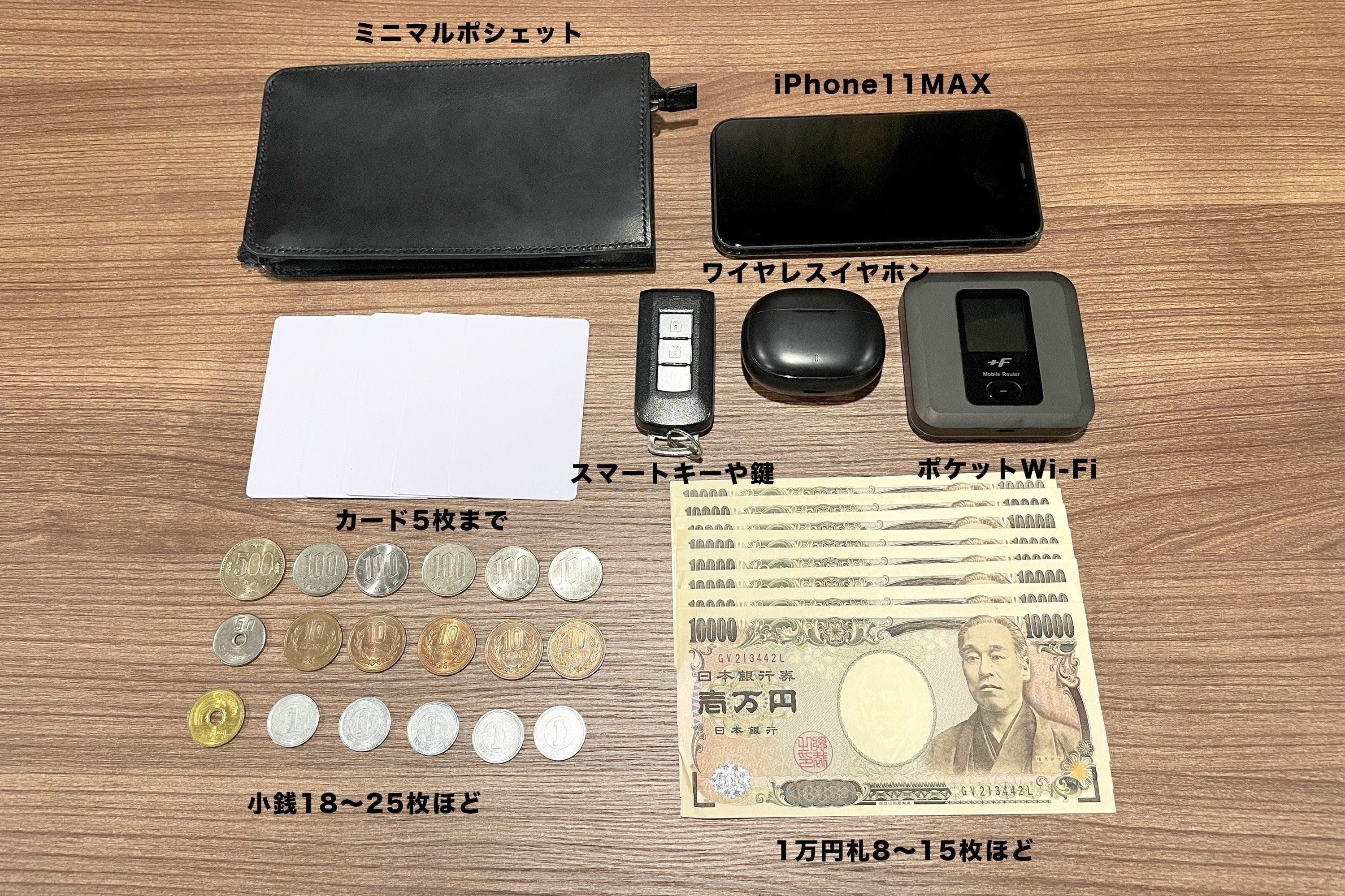 ミニマルポシェットは最低限が前提なので身分証、保険証、クレカ、その他2枚と必要最低限しか入らない仕様になっています。