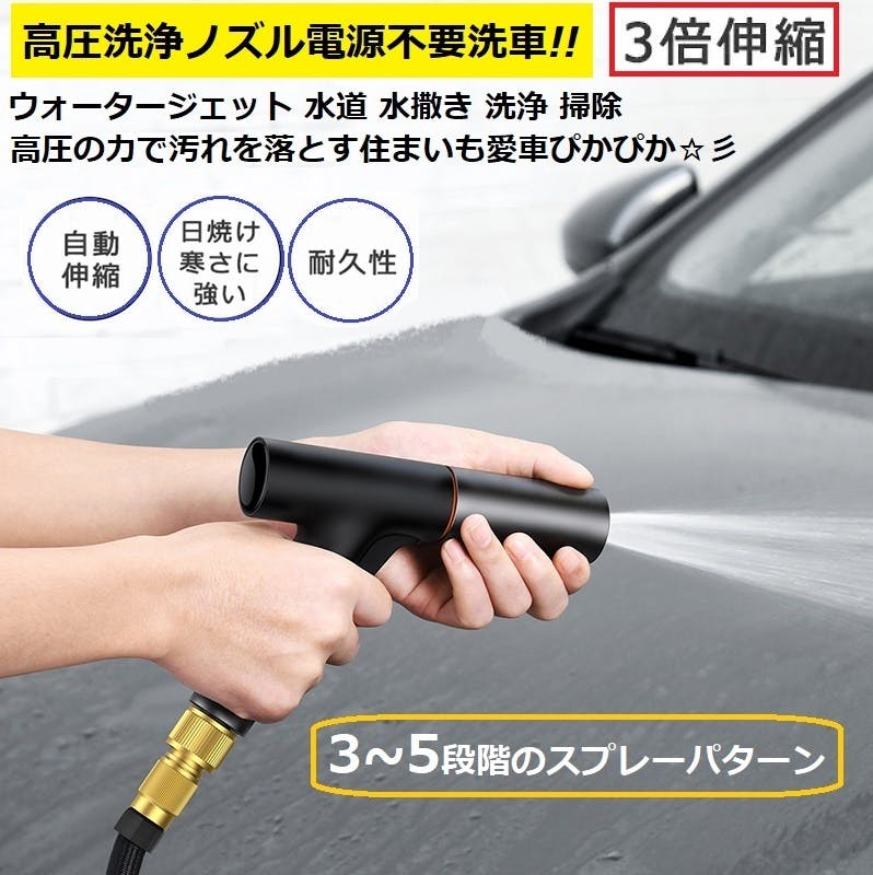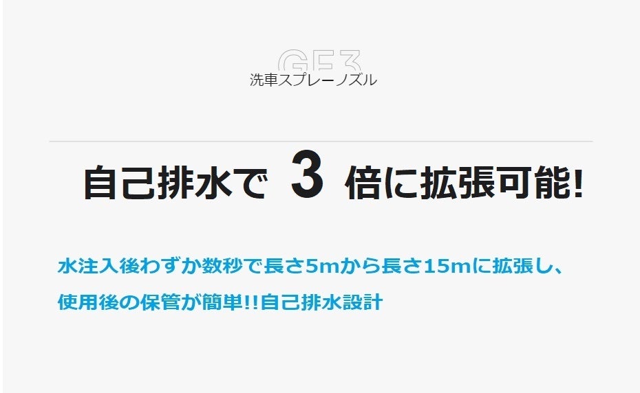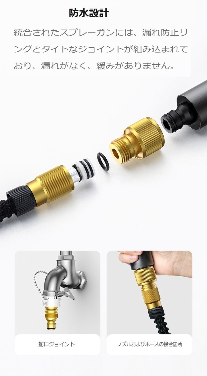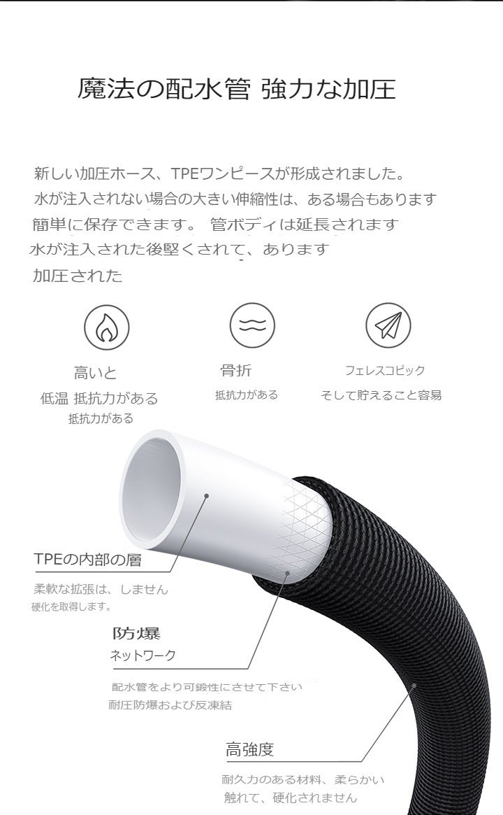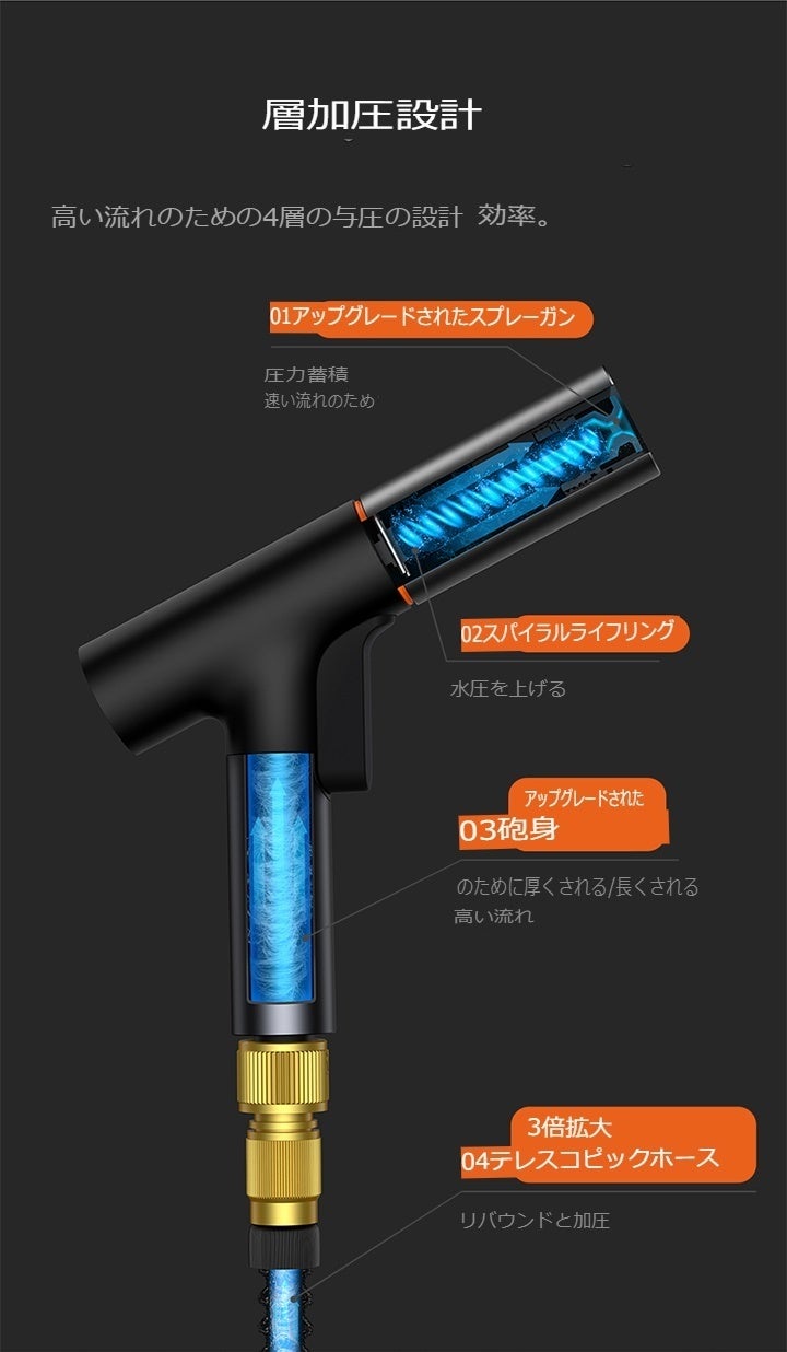 3倍伸縮できるホース&ノズル内部にある螺旋状のタービンの加圧設計が電気が掛からない様に水圧を上げる構造になっています。