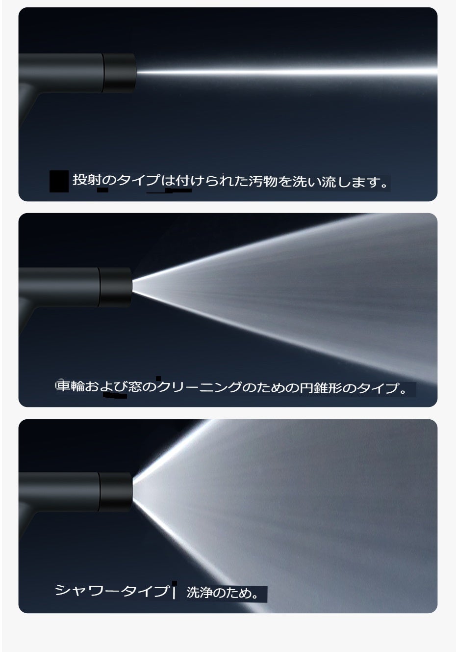 ●ノズルの前端を回すだけで高圧直噴、拡散噴射、シャワー、3~5種類の噴射モードの切り替えが可能!