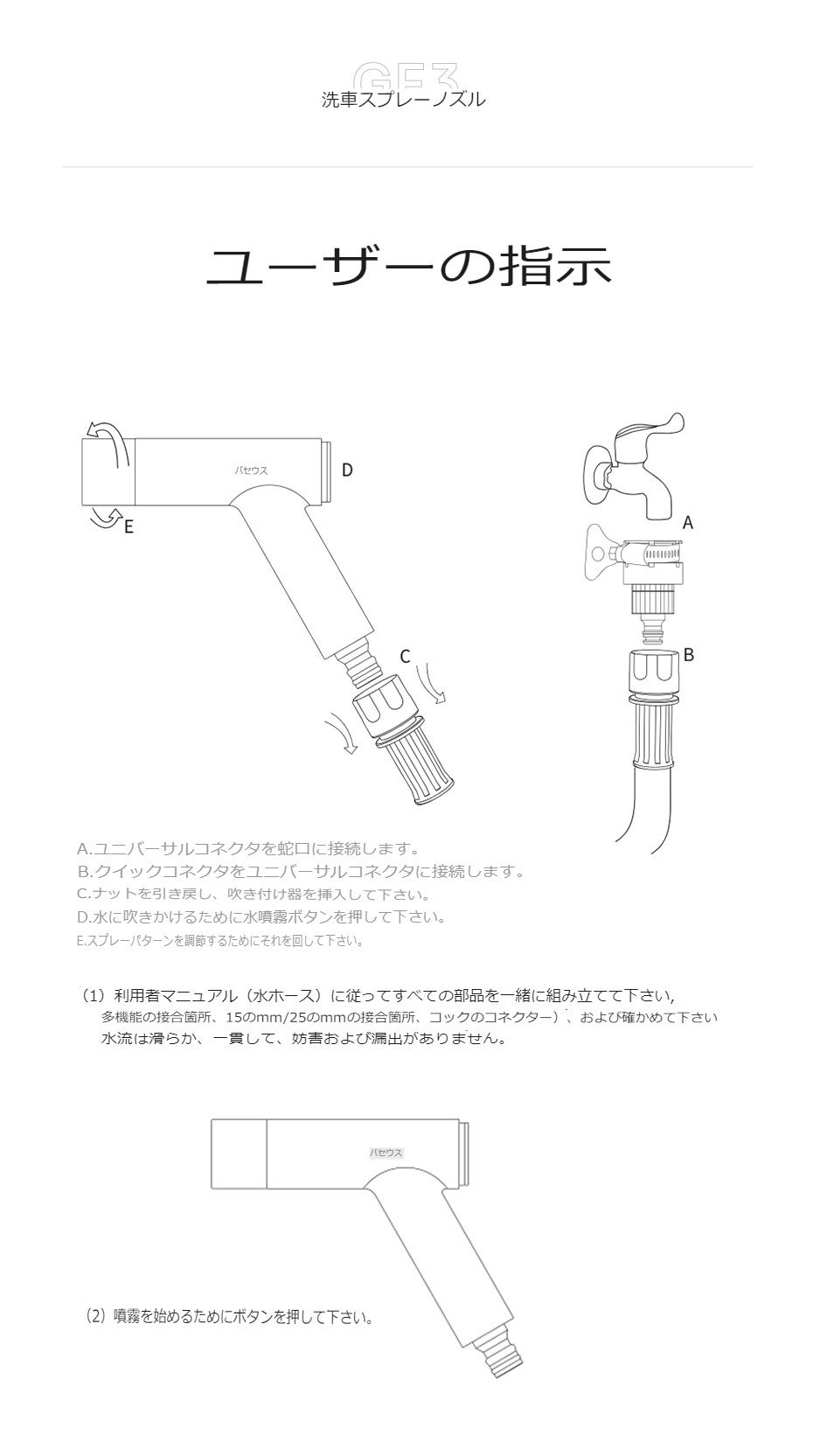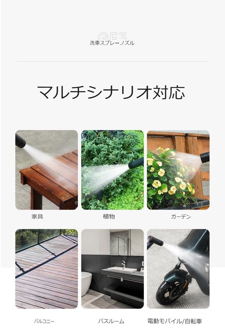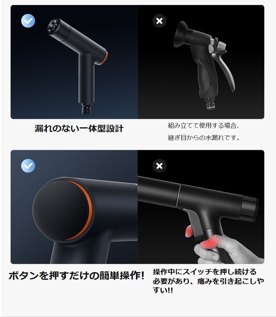 ●調整可能なマルチモードノズル:多機能ノズルにより、特定の用途に合わせてスプレーモードを簡単に調整し、