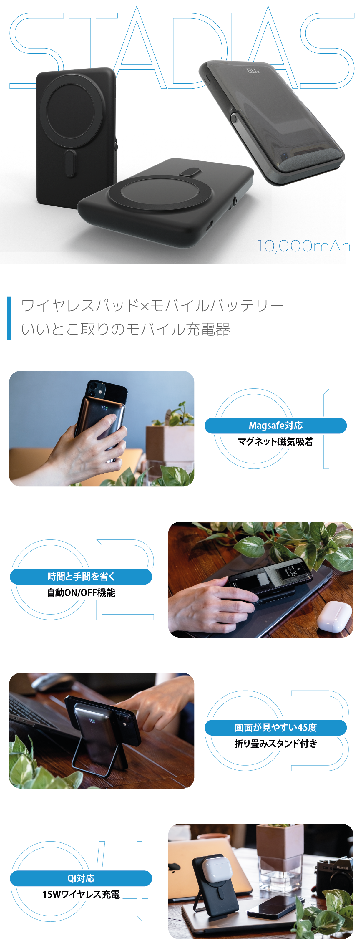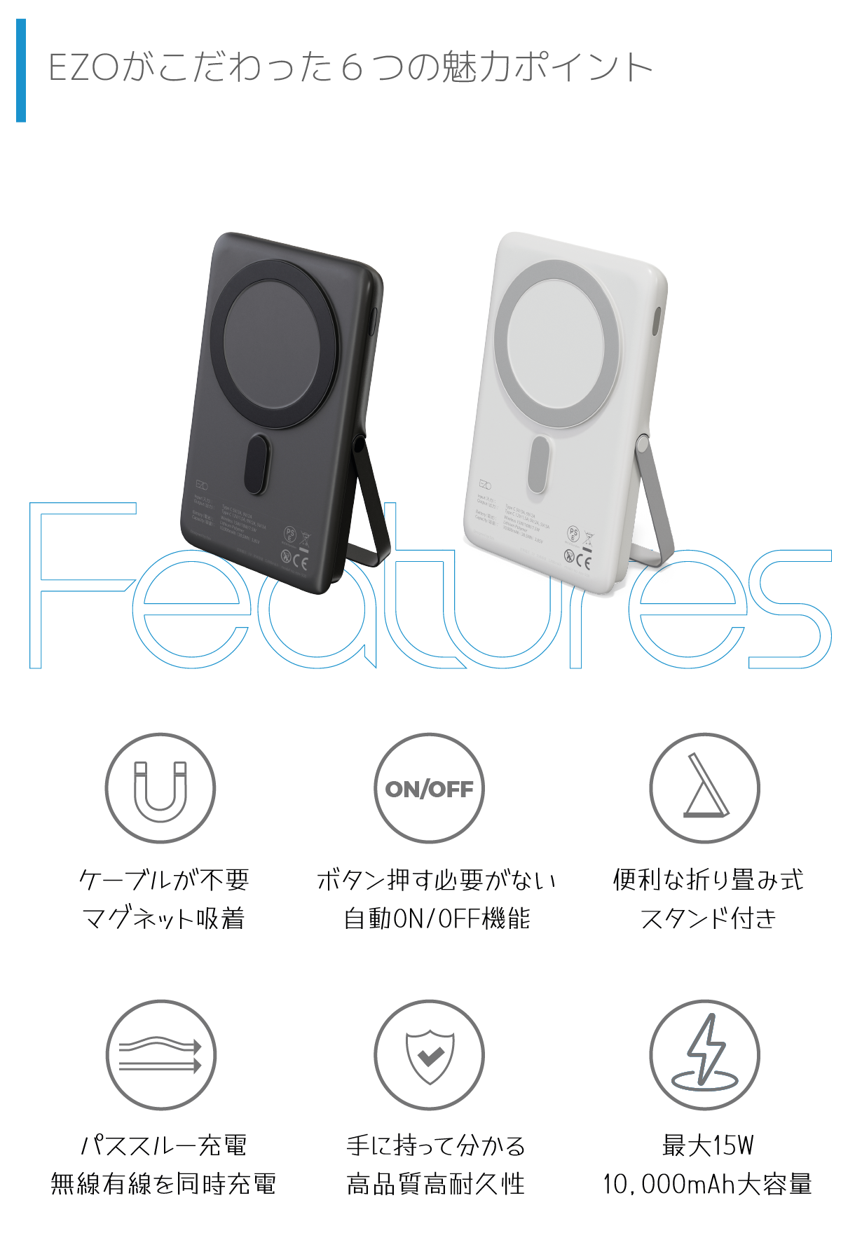 【EZO STADIAS】はスマホを近づけるだけでピタっとくっつき、ワイヤレスで即充電開始。電源ボタンを押す必要のない、モバイルバッテリーです。