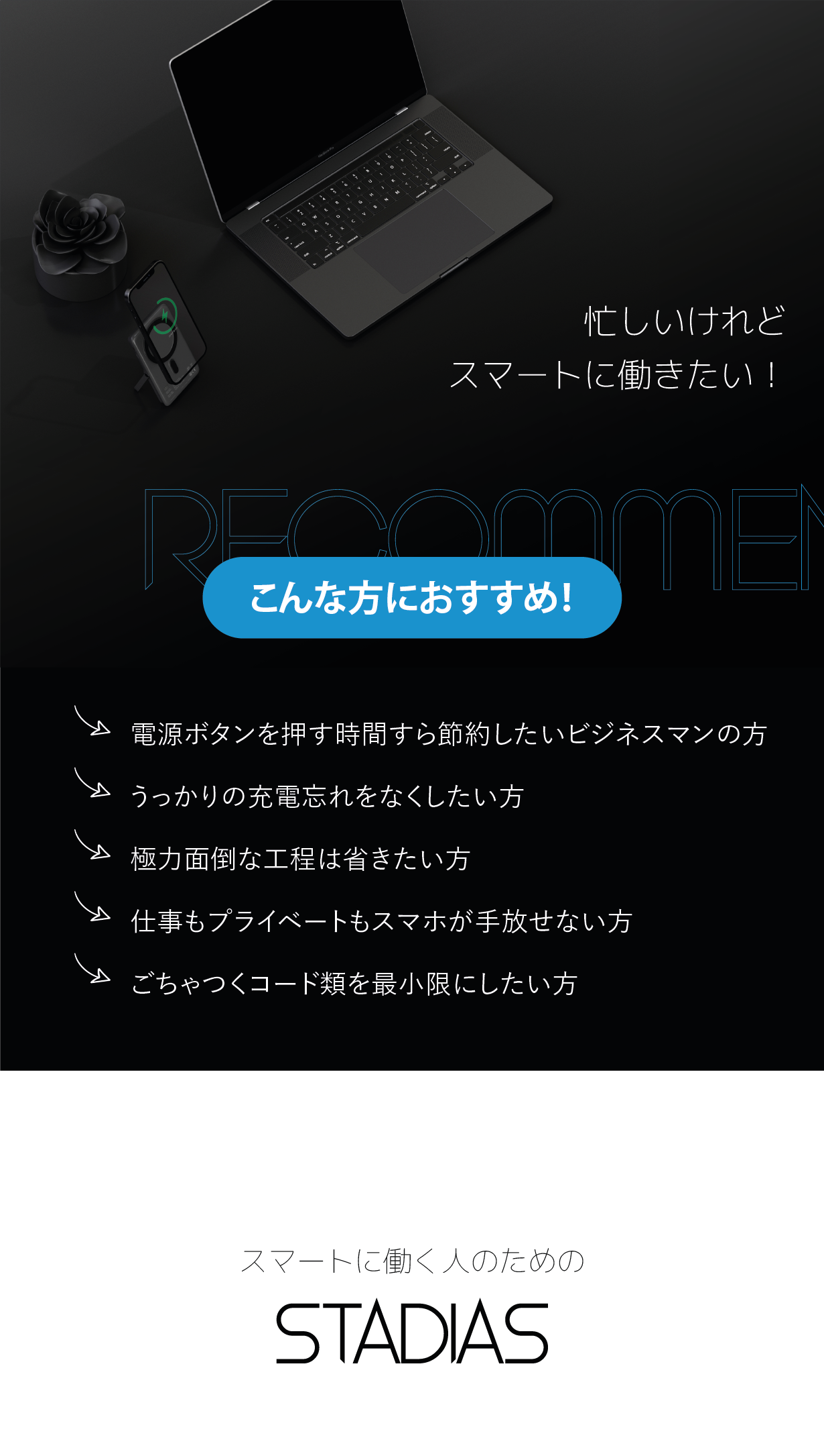 電源ボタンを押さなくても充電が開始される【EZO STADIAS】は、忙しいあなたのために設計されました。