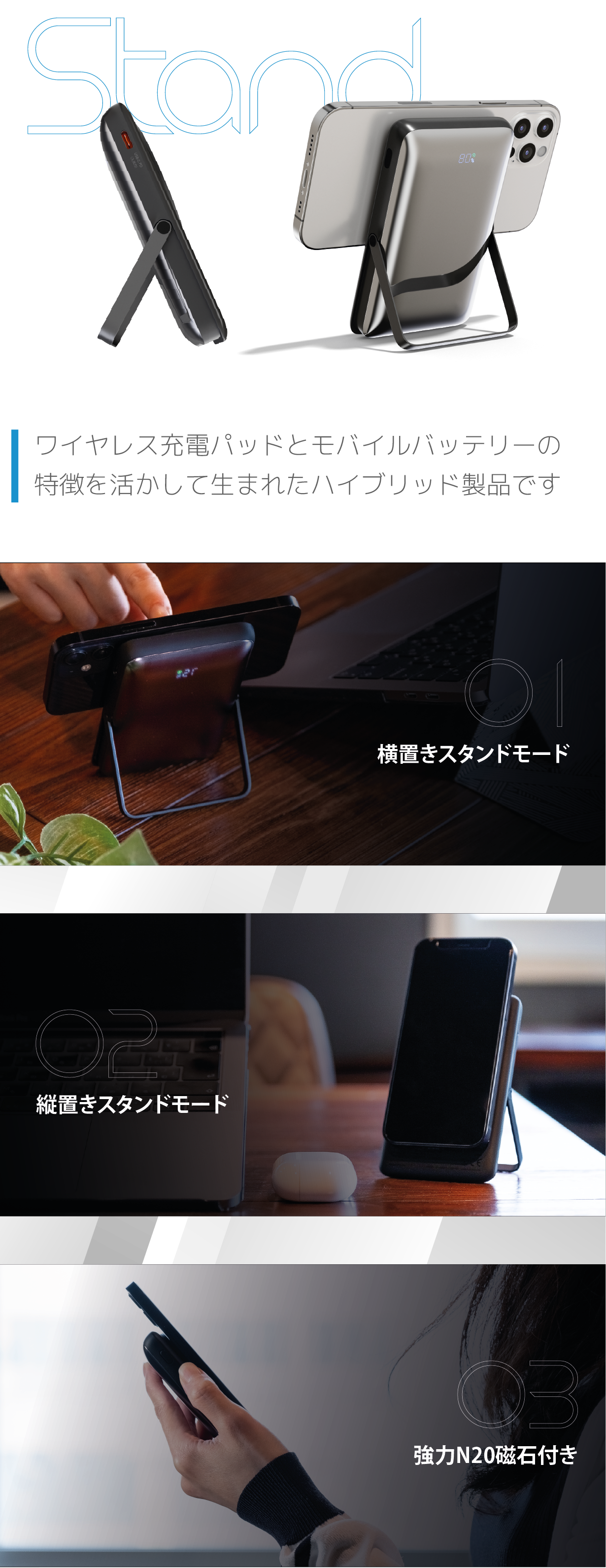 バッテリー自体がスタンドにもなるため、持ち運びだけでなく自宅用としても使えたり、