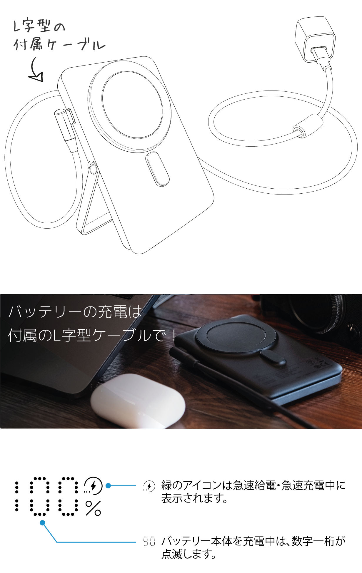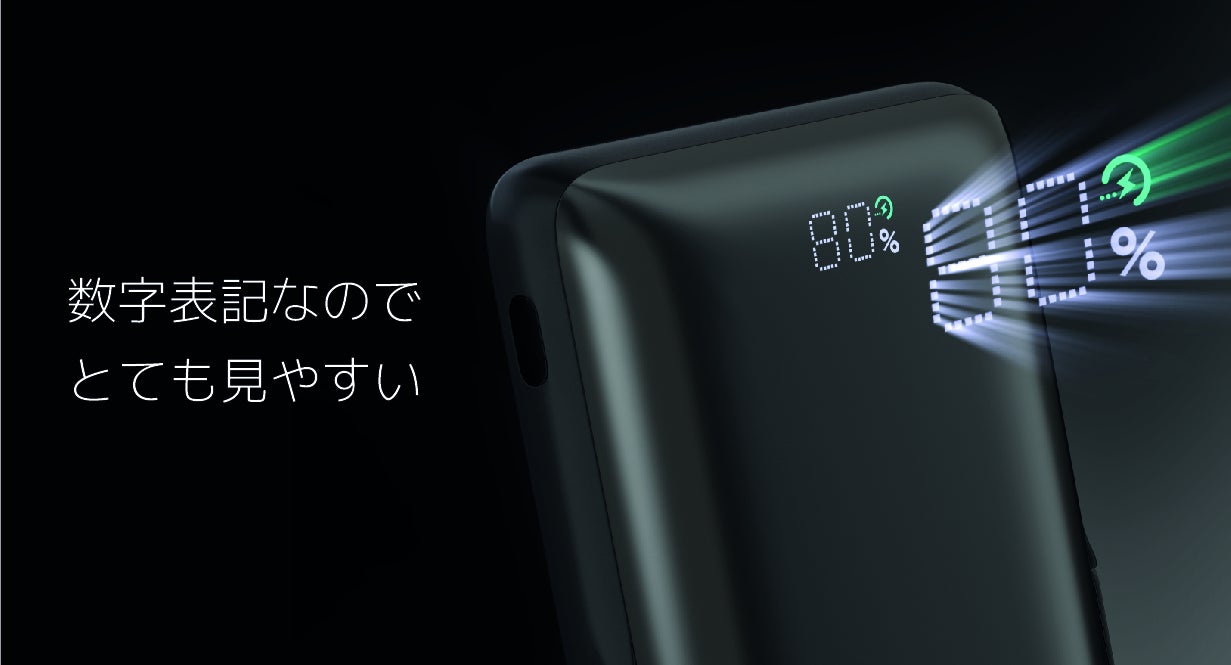 またバッテリー本体を充電時が1桁の数字が点滅、急速充電中は緑のアイコンが表示される、などその時々に合わせて表示方法が変わるのもわかりやすいですよ。
