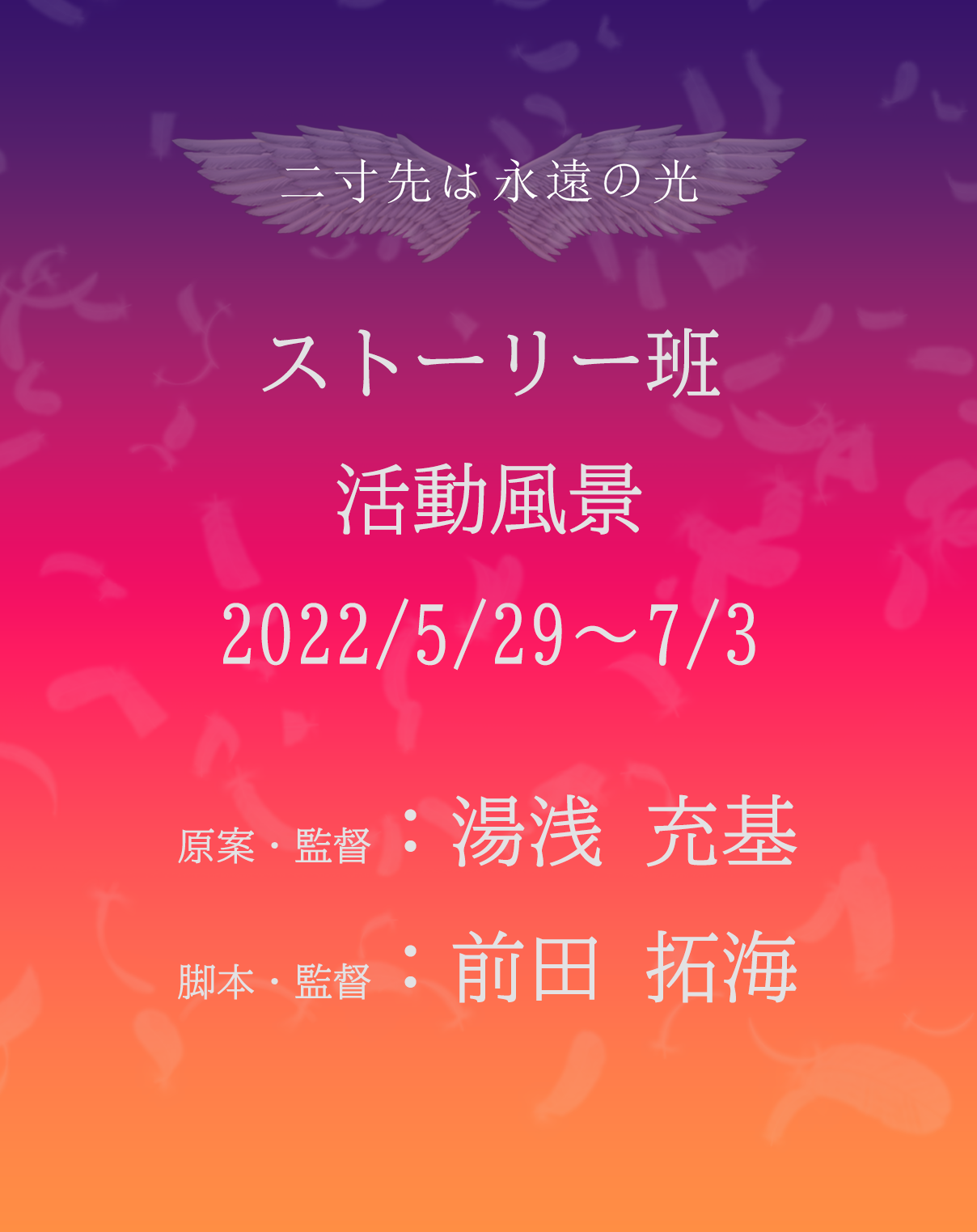 2022/10/09 09:31【フェーズ1】(2022/5/29~7/3)プロジェクト始動ストーリー班(監督陣)との活動風景を写真でご紹介します!★監督陣紹介★湯浅 充基 担当:監督・原案・キャラクターデザイン前田 拓海 担当:監督・原作・脚本・音響監督●湯浅さんに原案を考えてきて頂きました●●湯浅さんの原案を元に前田さんが「小説」に書き起して頂きました●●キャラクター設定・デザインを構想● もっと見る