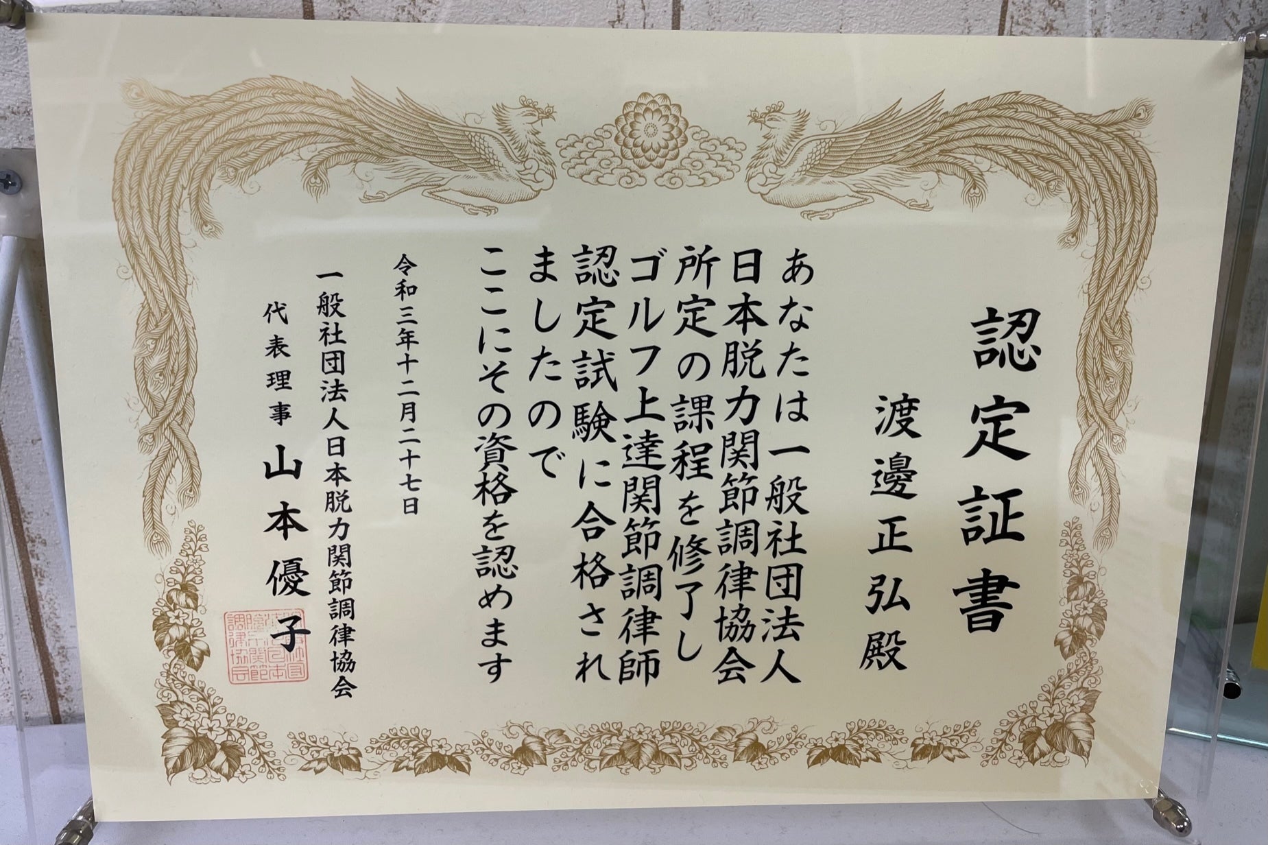 知人の紹介で、ゴルフ上達に関する整体を行う「一般社団法人日本脱力関節調律協会」の山本優子氏のもとで指導を受け「ゴルフ上達関節調律師」の資格を取得しました。