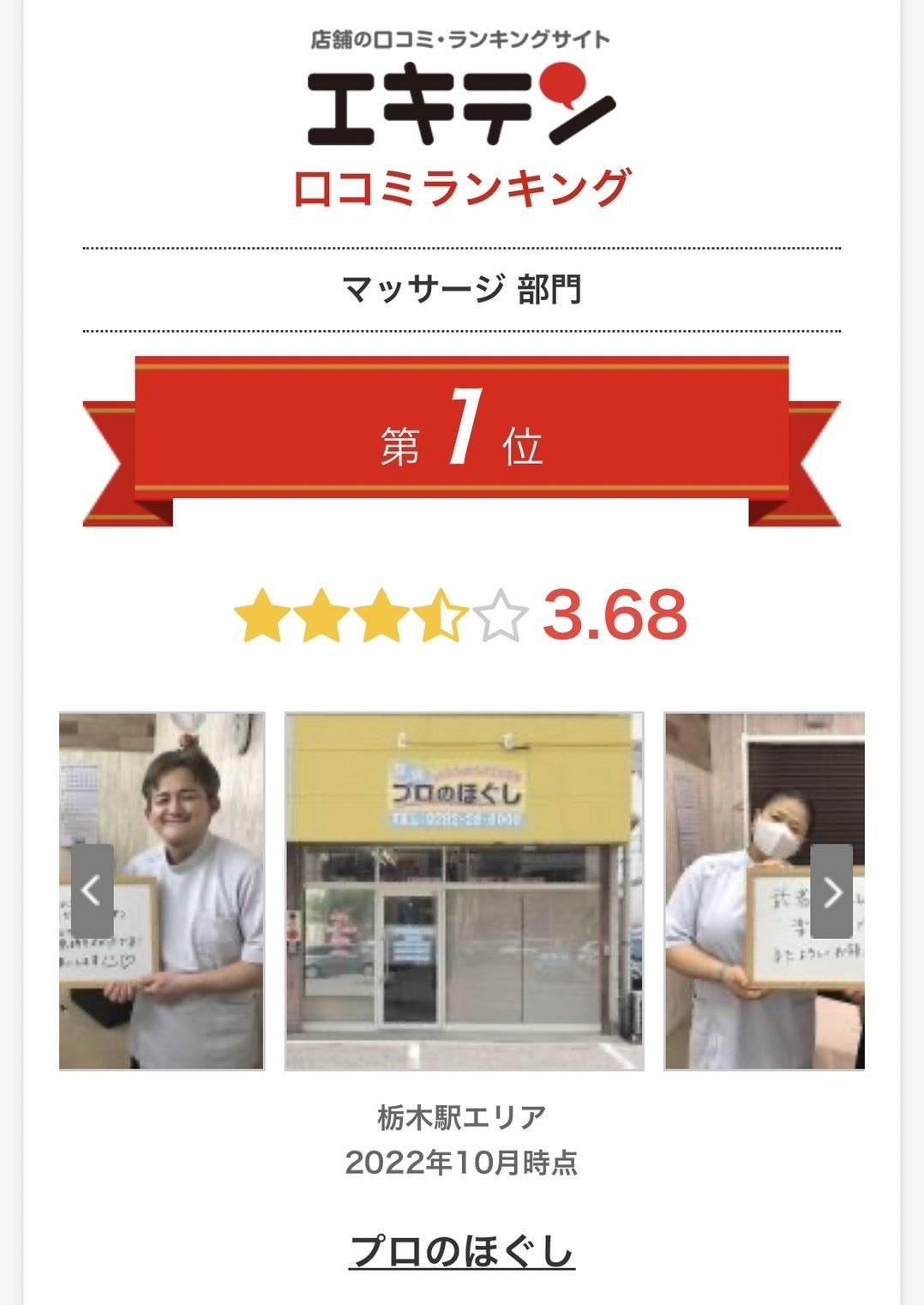 2015年に開業した「プロのほぐし」は、多くのお客様の支えとスタッフの協力のおかげもあって、栃木県駅前エリアにて口コミ1位を獲得することができました。