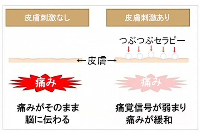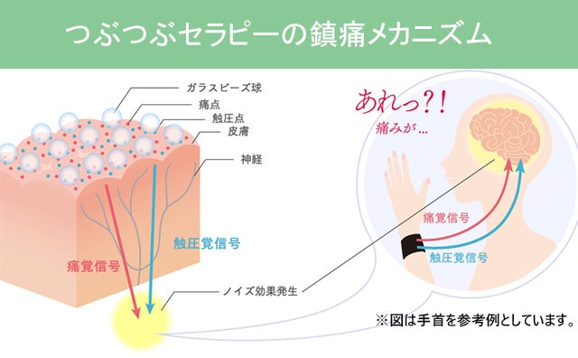 その時、ガラスビーズ球がびっしりと敷き詰められた“つぶつぶセラピー”を痛みのある部分に装着すると“触圧点”が刺激され、触圧覚信号が発生します。この二種類の信号が、脳への伝達時にぶつかり、ノイズ効果が生まれることによって、痛みが和らぎます。
