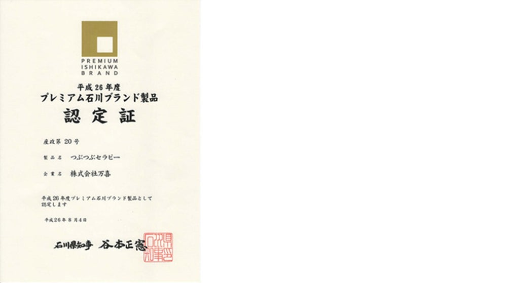 石川県は新規性や技術の独自性等において優秀でブランド化できる可能性が高いと認められる製品を「石川ブランド製品」として認定しています。「つぶつぶセラピー」は石川ブランド製品の中でも最優秀賞の「プレミアム石川ブランド製品」として認定されました!