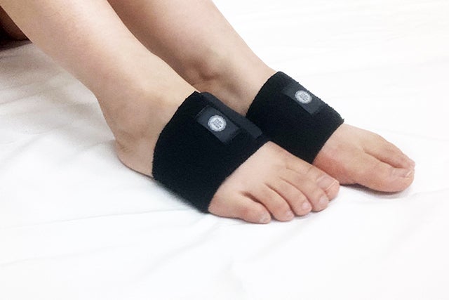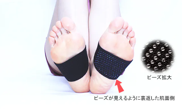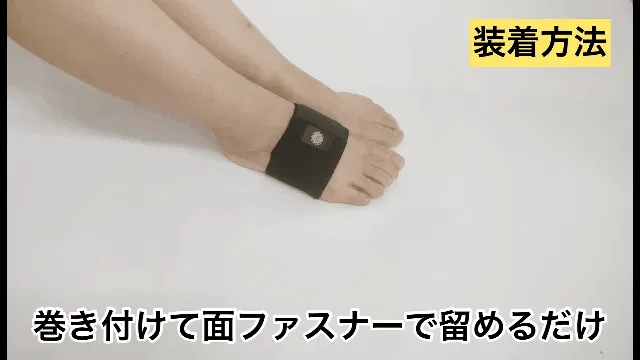 ガラスビーズが足裏(患部)にあたるように巻き付けて、面ファスナーで留めるだけの簡単装着です。