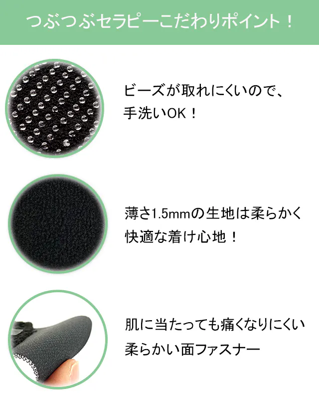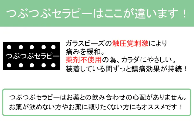 つぶつぶセラピー は、びっしり敷き詰められたガラスビーズが皮膚を刺激することで、痛みを緩和します。