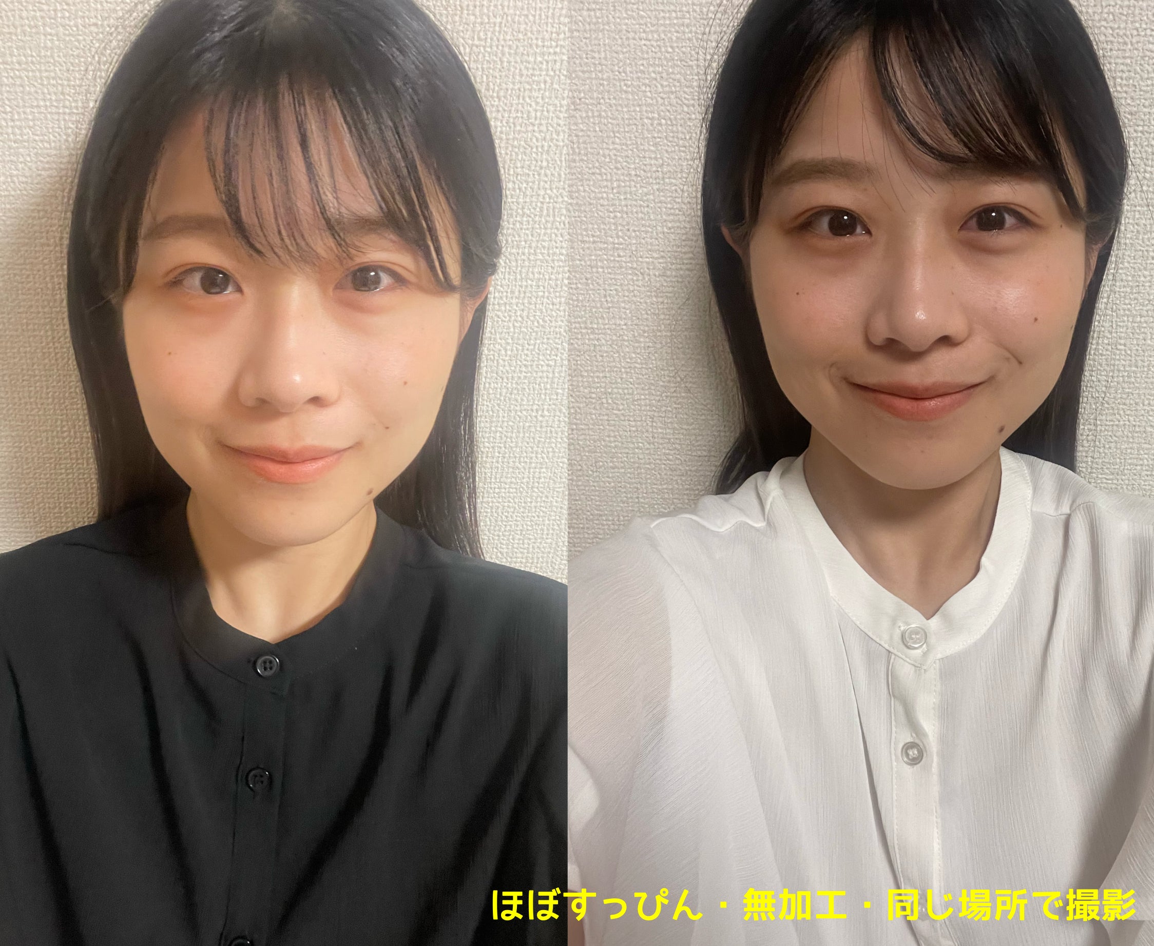 以下、参考画像です。左側の黒のトップスもシックで大人らしい印象になりますが、私の顔色をよく写してくれるのは、なんとなく右側の白の方だと感じますね。(ちなみに黒色のトップスはどんなに違う角度でとっても画面がぼんやりしてしまいました。)