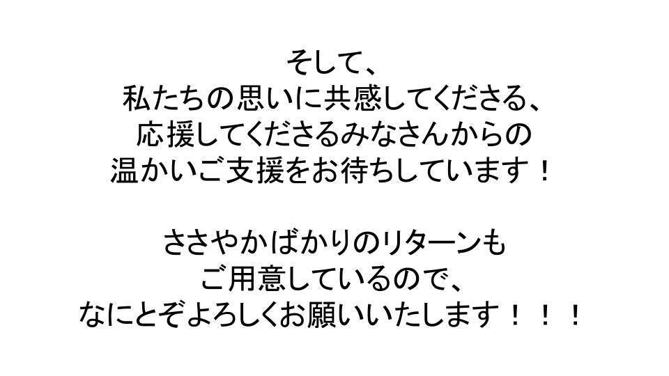 ・スポンサープラン(支援していただいた方に、お名前などを紹介させていただきます!):100,000円