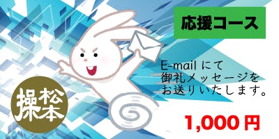↑松本操より心を込めた御礼メッセージ(E-mail)をお送りいたします。 ※こちらのコースはリターンの商品はございません。 E-mailでのメッセージの送信をもって、返礼とさせて頂きます。 ご了承ください。