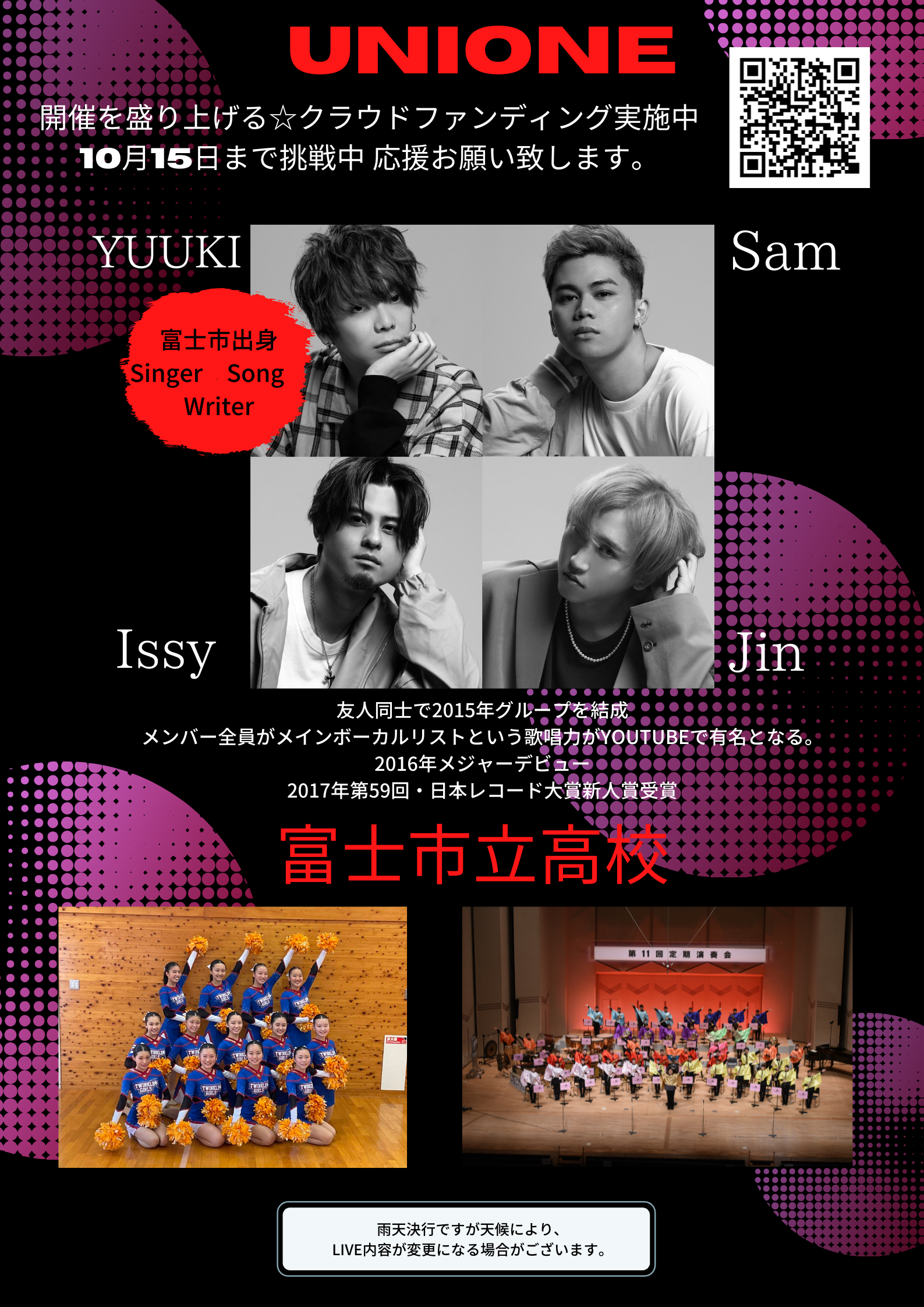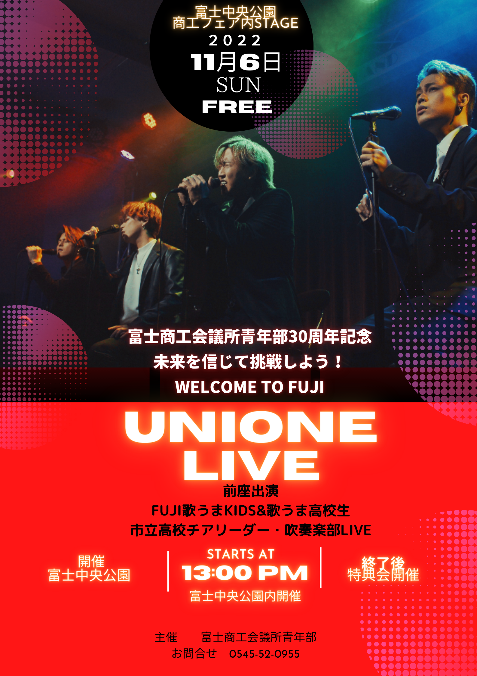 UNIONEはシンデレラストーリーを持つ、才能あふれる音楽ユニットです。富士市でのライブの成功と、メンバー一人ひとりが未来も大いに活躍されることを願います。当日は主催スタッフ一同、おもてなしの心で富士の地でお待ちしています。どうぞよろしくお願いいたします。