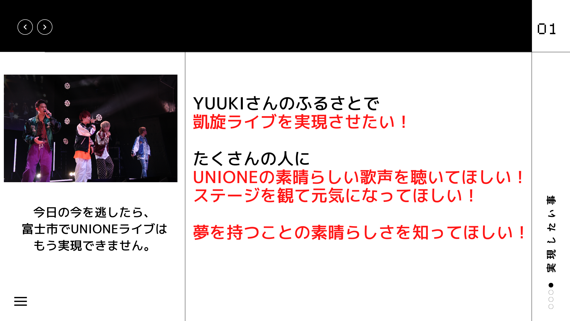 UNIONEふるさと凱旋ライブ・ファンや観客の皆様・UNIONEや富士市の未来にむけて、さらなる良いライブになるようネクストゴールに挑戦をして参ります。人気のリターンを限定で追加をさせていただきました。からのご支援に関しては、ライブとは別に富士市と来ていただける機会をつくりライブがさらに盛り上げるよう富士市でのPR事業に充当をしていきたいと思います。現在調整をさせていただいておりますので、経過報告でお知らせをさせていただきます。