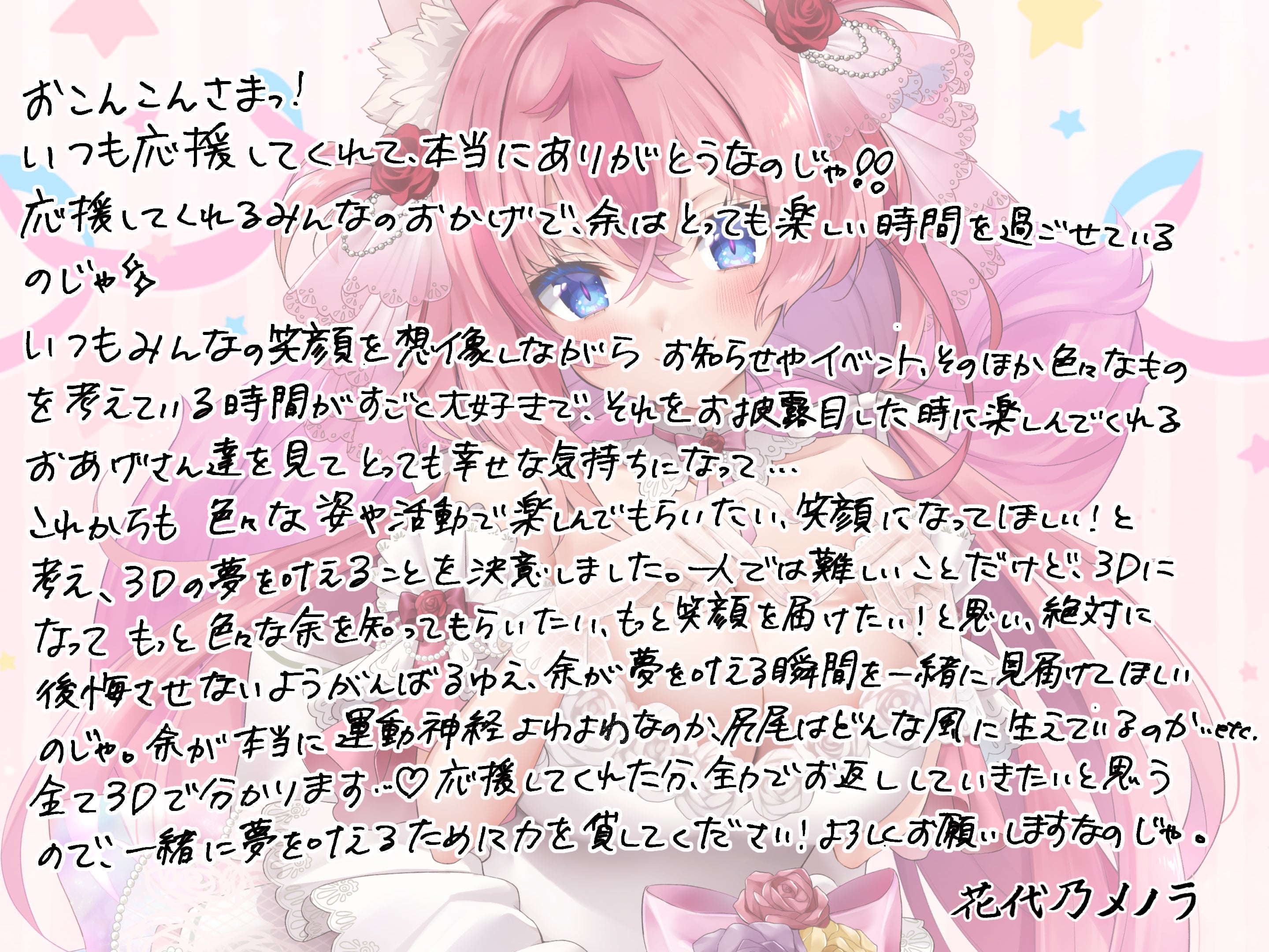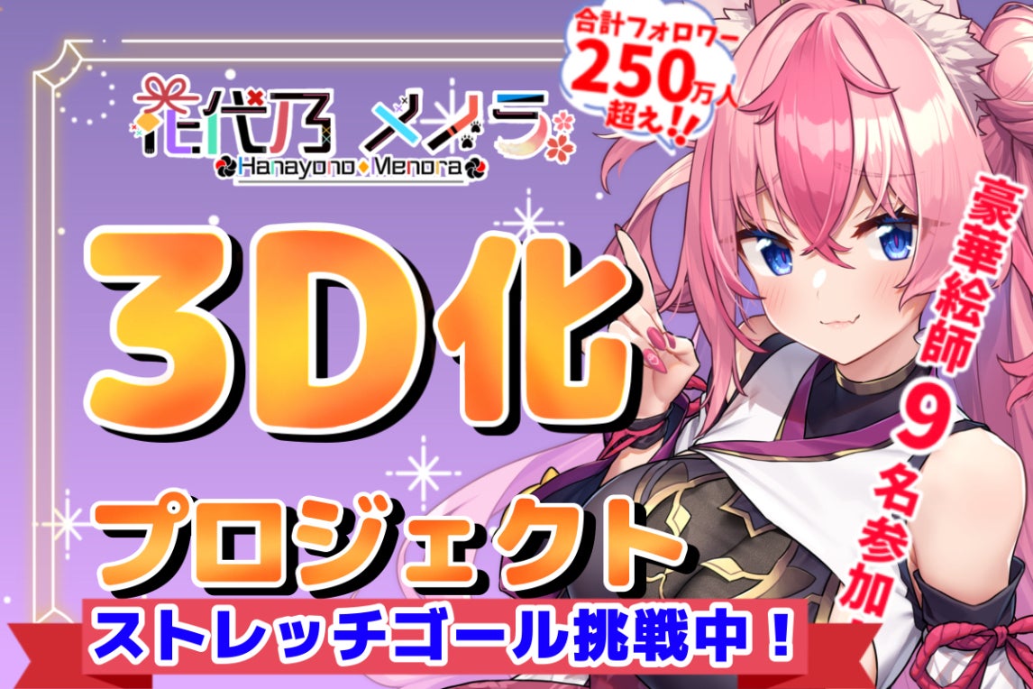 まず1.5周年で、”花代乃メノラ”らしい「お披露目配信」を行いたいと考えています。そして、その後も配信やイベントなどで3Dの姿を生かした企画やライブを行っていく予定です!