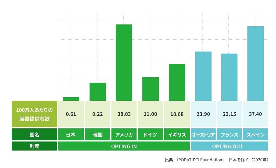 「世界の臓器提供数を人口100万人あたりの臓器提供者数として世界の国々と比較すると、日本は0.61であり、アメリカの1/46、韓国の1/15に過ぎないことから、他国と比較して臓器の提供件数が少ないといえます。」(日本臓器移植ネットワークHPより抜粋)