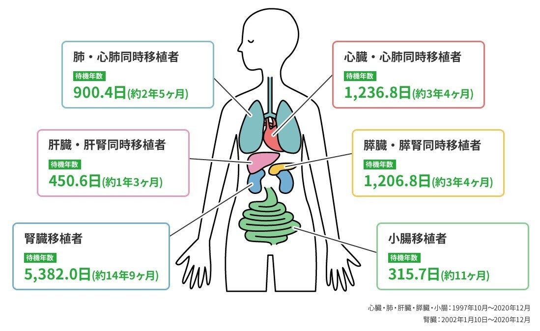 日本国内の臓器提供数の少なさに伴い、下の図のように日本は各臓器の移植待機期間が異常に長く、移植待機中に命を落としてしまう人も少なくありません。