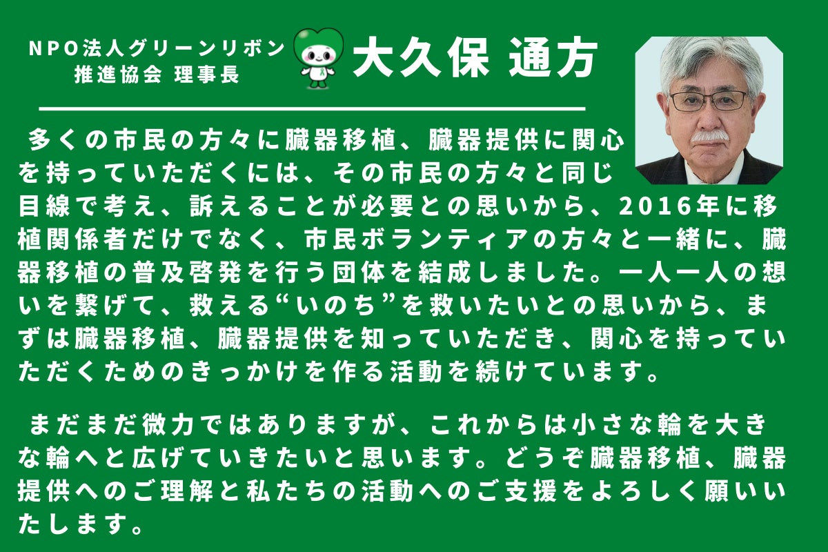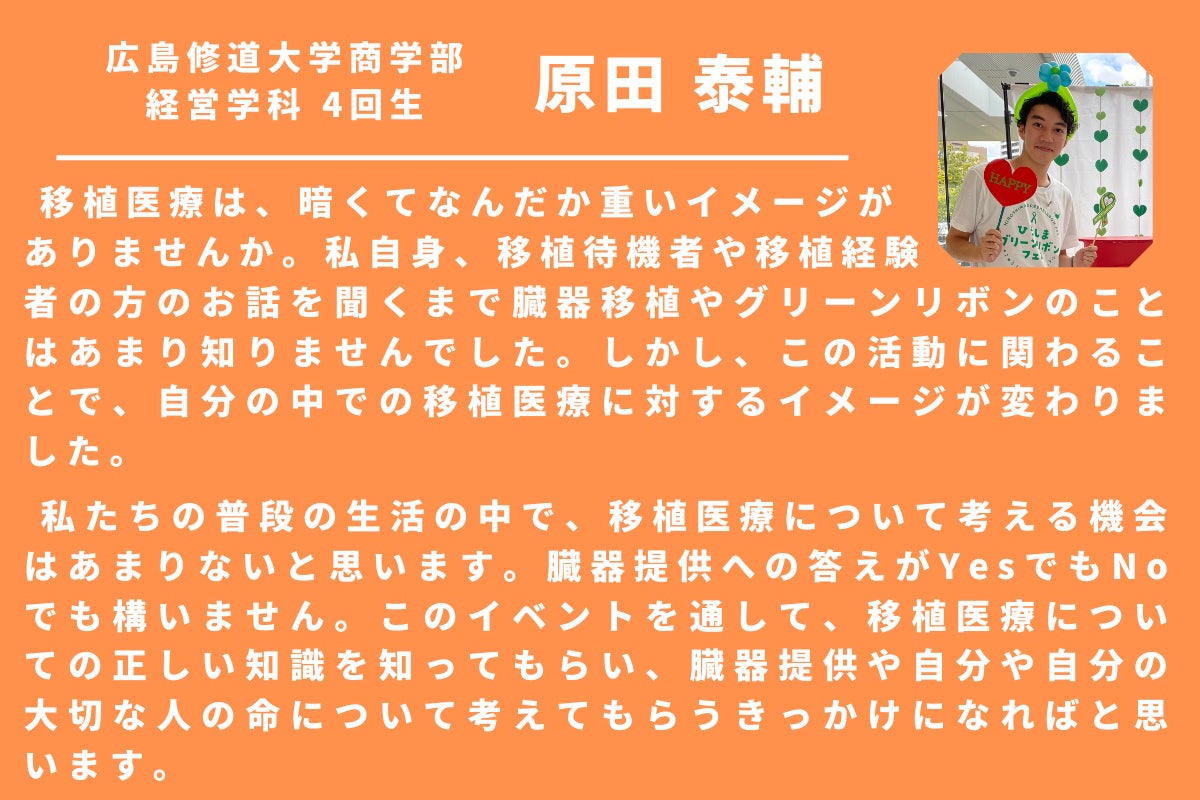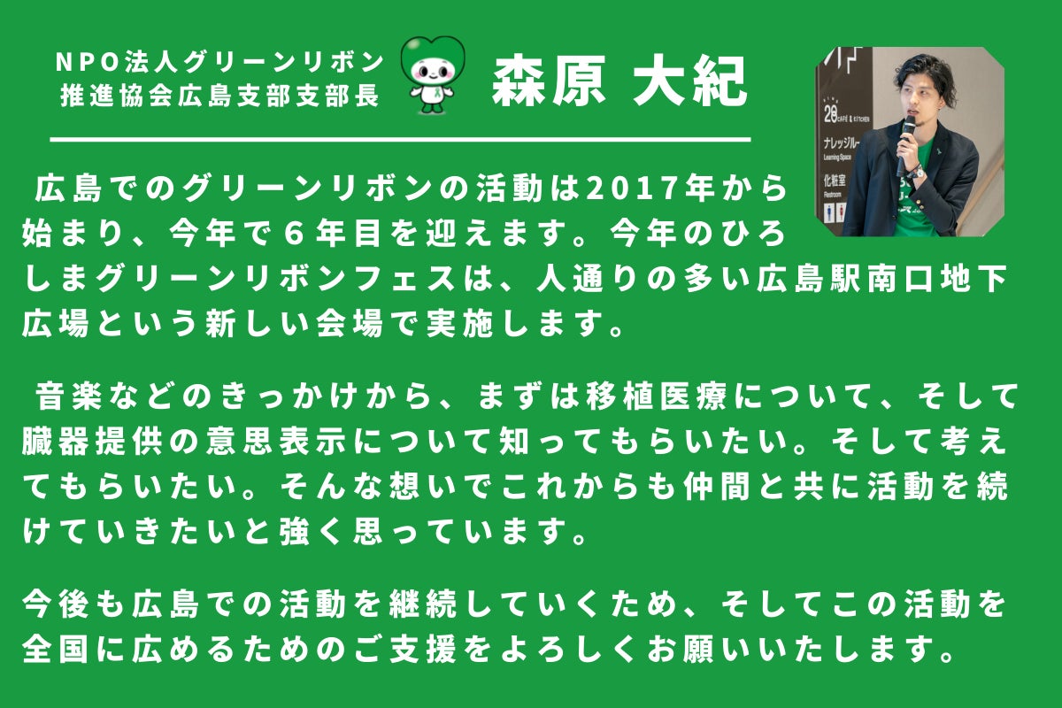 この広島の形をもっと全国に広げ、1人でも多くの方にグリーンリボン、移植医療について知ってもらい、移植医療で助かる命を救える日本に変えていきます。
