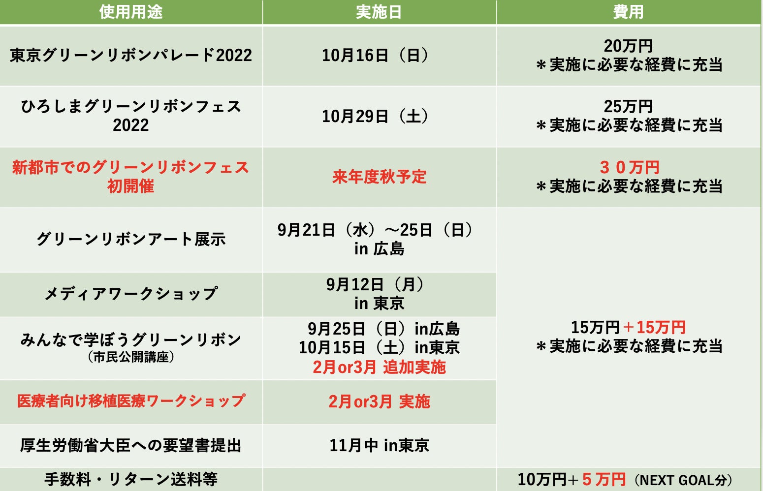 ②15万円 今年度2月もしくは3月でみんなで学ぼうグリーンリボン(市民公開講座)を追加開催、医療者向けワークショップを初開催します。市民に対して移植医療について学ぶきっかけを増やし、また移植医療普及に直結する医療者向けに、臓器移植や臓器提供について専門家から深く学ぶことのできる場を作ります。