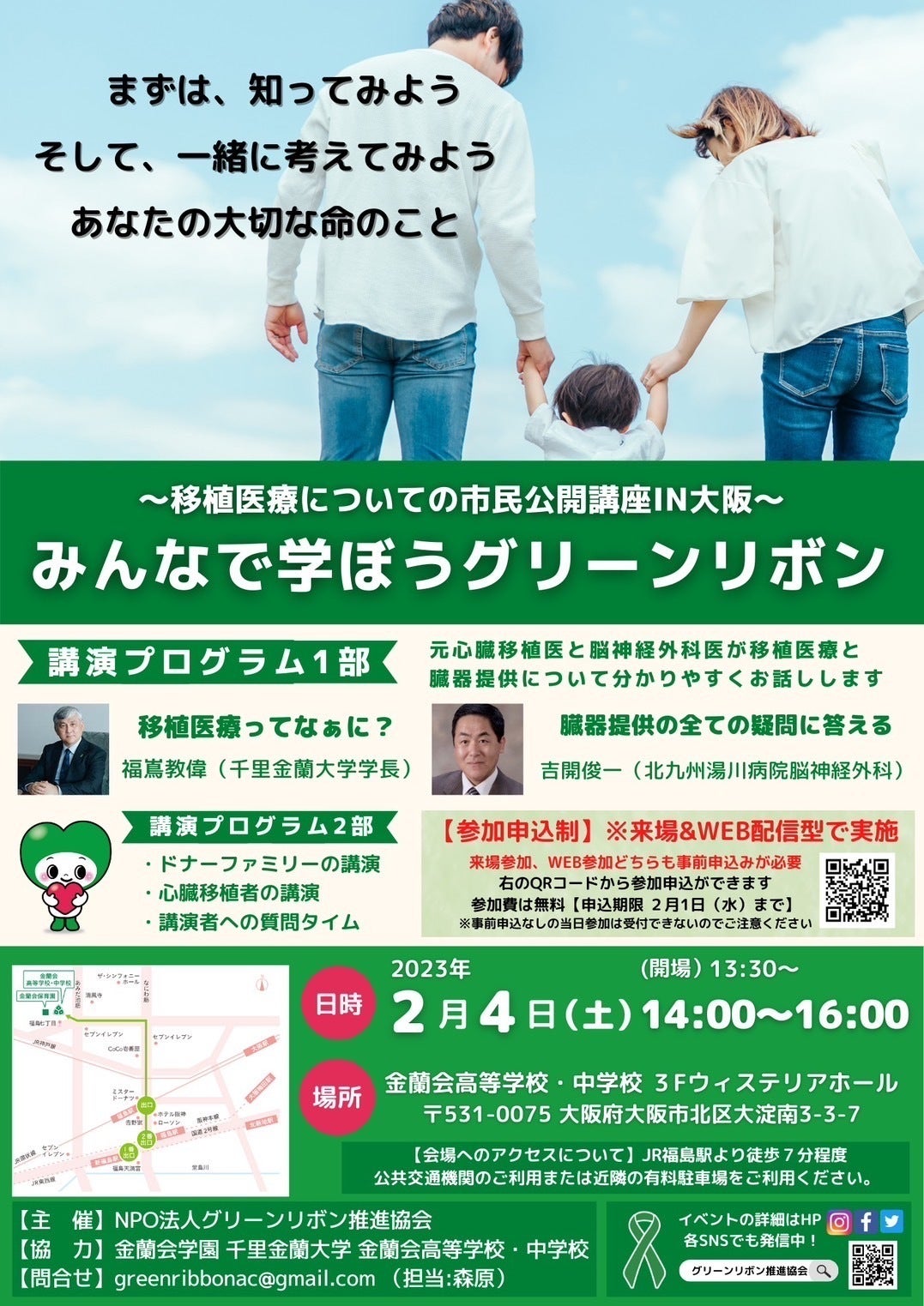 2023/01/31 14:31支援者のみなさまへこんにちは。NPO法人グリーンリボン推進協会です。みなさまからのご支援により2月4日(土)大阪の金蘭会中学校・高校にて市民公開講座「みんなで学ぼうグリーンリボン」と医療者向けの移植医療勉強会が初めて実施できます。改めて御礼申しあげます。写真にある2月4日(土)の移植医療についての市民公開講座「みんなで学ぼうグリーンリボン」の参加申込期限が明日の2月1日(水)までとなっております。来場・WEB参加(YouTubeライブ配信を利用)にてご参加いただける方は、下記の申込リンクより申込いただけますと幸いです。申込はこちらをタップ/クリック(グーグルフォーム)まずは、知ってみようそして、考えてみようあなたの大切な命のことみなさんのご参加を心よりお待ちしております。◯日時 2023年2月4日(土)14:00-16:00 開場13:30〜◯場所 金蘭会高校・中学校3Fウィステリアホール(JR福島駅より徒歩7分ほど)◯参加無料、WEB配信あり、事前申込必須#いのちがつながる未来のために※リターンについて リターンの活動報告書(メール添付にて送付)に関しては、上記の2月イベントの様子も掲載してお送りします。また、グリーンリボンカープコラボバッジに関しても、活動報告書完成タイミングに合わせて発送予定にしております。お待たせして申し訳ございませんが、よろしくお願いいたします。 もっと見る
