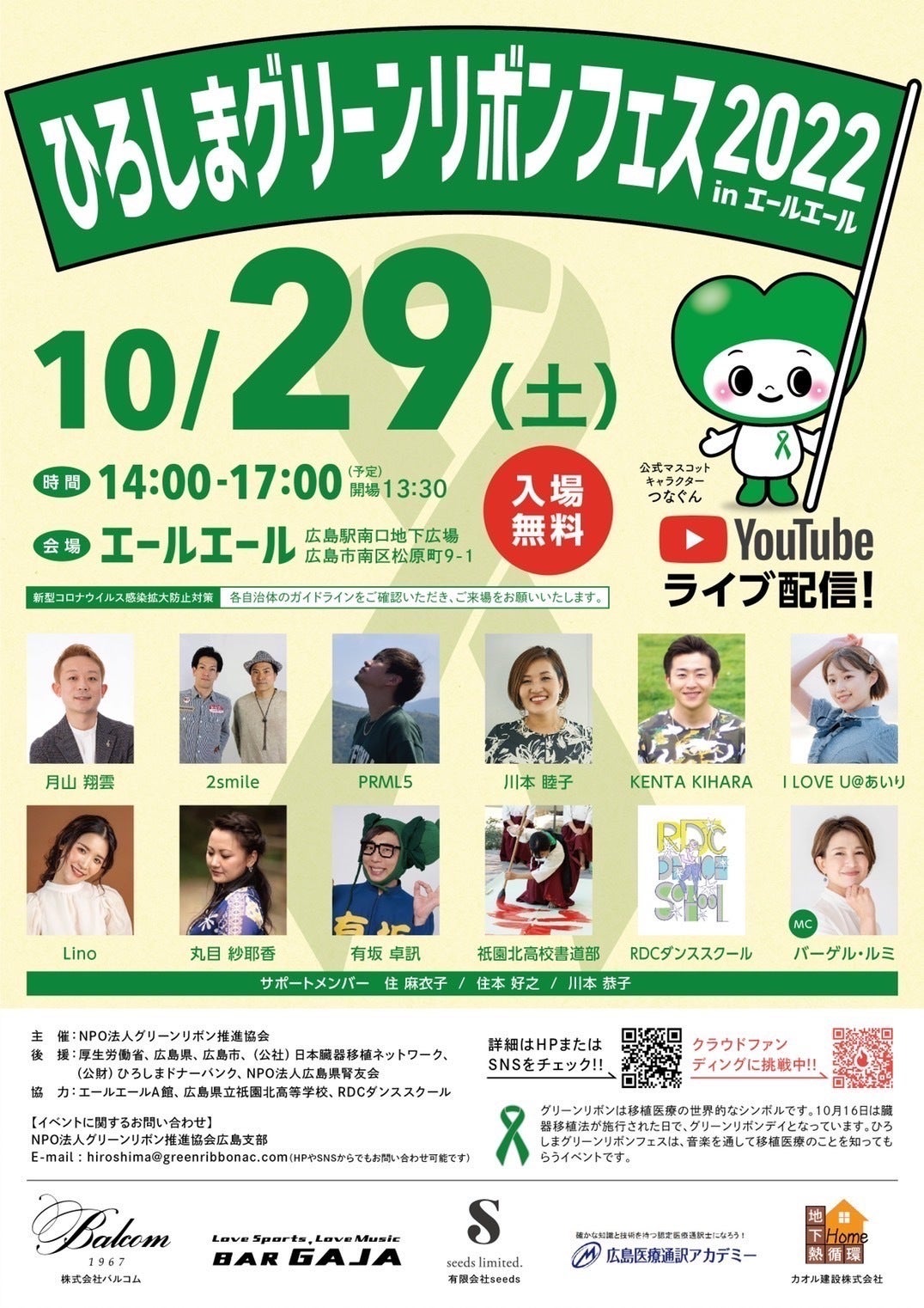 支援者のみなさまへひろしまグリーンリボンフェス2022開催についてのお知らせです。10.29(土)14時〜17時 エールエール広島駅南口地下広場にて、ひろしまグリーンリボンフェス2022を開催いたします。広島県内等にお住まいの方は、広島駅よりすぐの場所にございますので、ご来場いただけると嬉しいです。チラシには掲載されていない移植医療を知るプログラムや、移植者体験談、楽しみながら学べるワークショップブースなどを実施する予定です。オープンスペースでより多くの方にグリーンリボンについて、移植医療についてまずは知ってもらうきっかけづくりをしていこうと思います。また今年もYouTubeライブ配信を実施します。こちらも宜しければご覧ください。【URL】https://youtu.be/jDkIdoDmnQY本番に向けてメンバー全員で準備の方進めてまいりますので、どうぞよろしくお願いいたします。NPO法人グリーンリボン推進協会