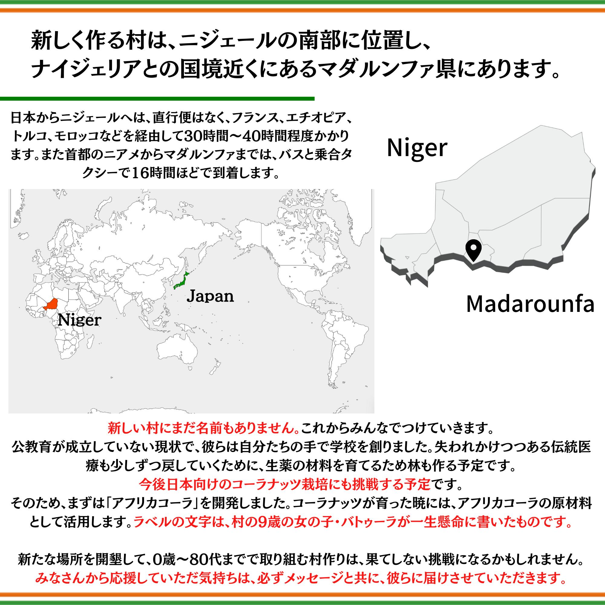 そこでは、西アフリカ原産とされるコラの実を栽培する予定です。そのうち、コラの実が育ち、輸入できるようになったら、製造・販売したいという目的で開発した「Africa Cola」など返礼品として用意しています。ニジェールの村のコラの実のコーラができるよう、応援よろしくお願いします!