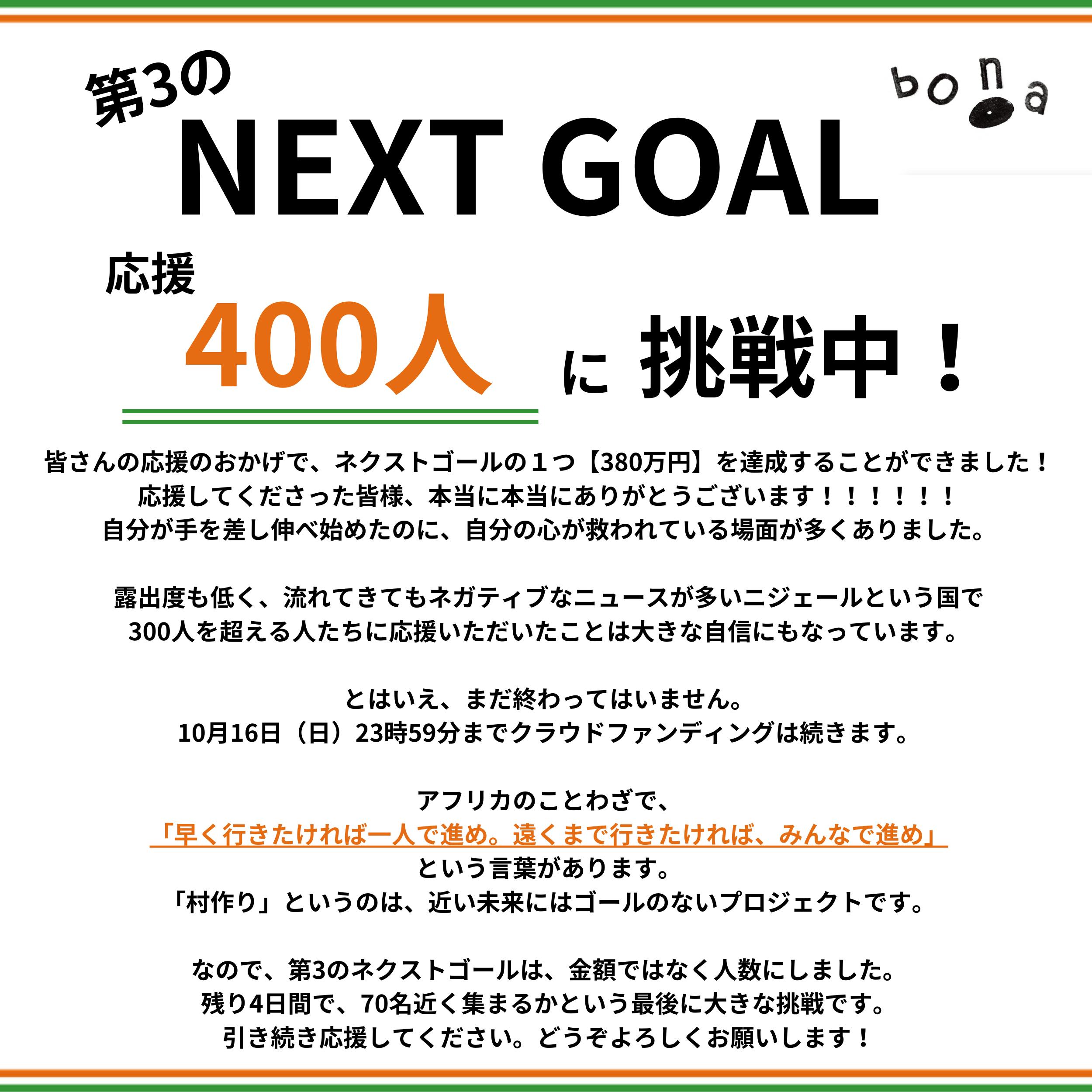 そして、クラウドファンディングは10月16日(日)23:59まで続きます。第3のセカンドゴールは、応援 400人に挑戦することにしました。僕の好きなアフリカのことわざに「早く行きたければ一人で進め。遠くまで行きたければ、みんなで進め。If you want to go fast, go alone. If you want to go far, go together. 」というものがあります。