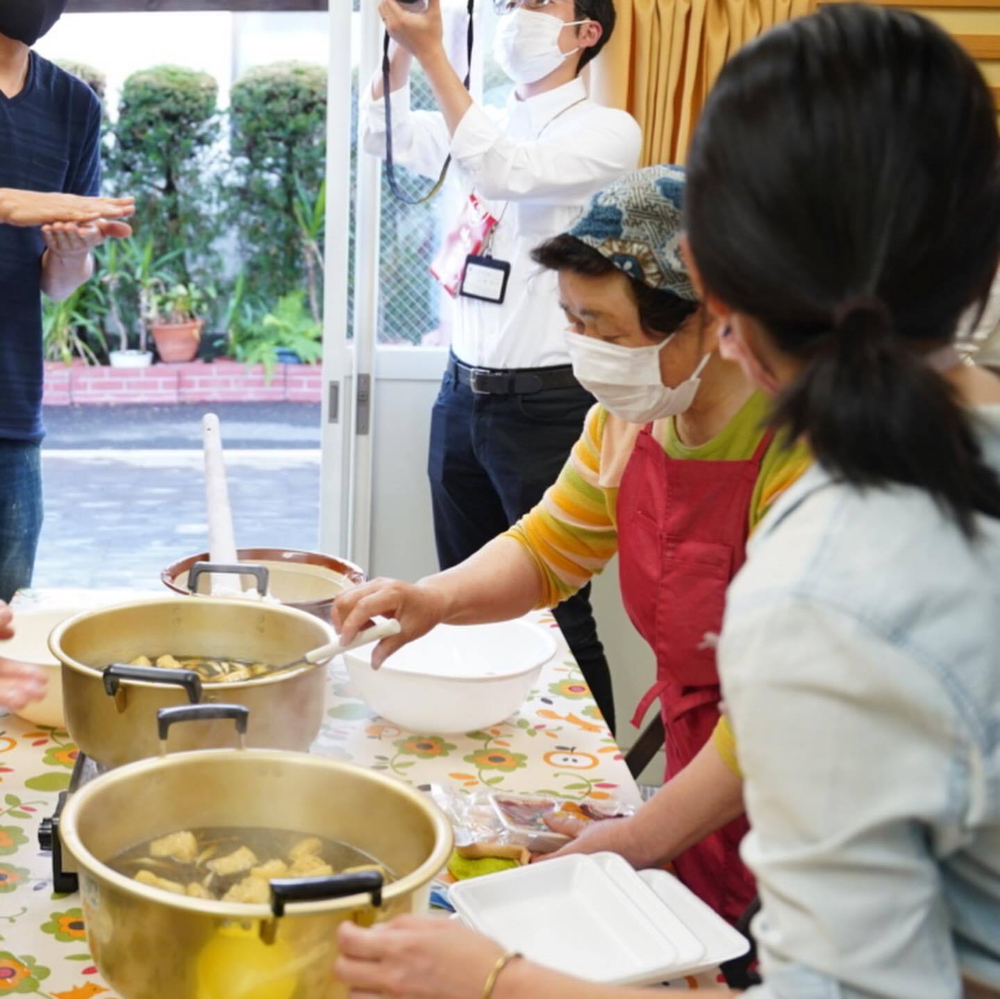 おしげちゃんに能代の郷土料理だまこ鍋の作り方を教えてもらっている様子