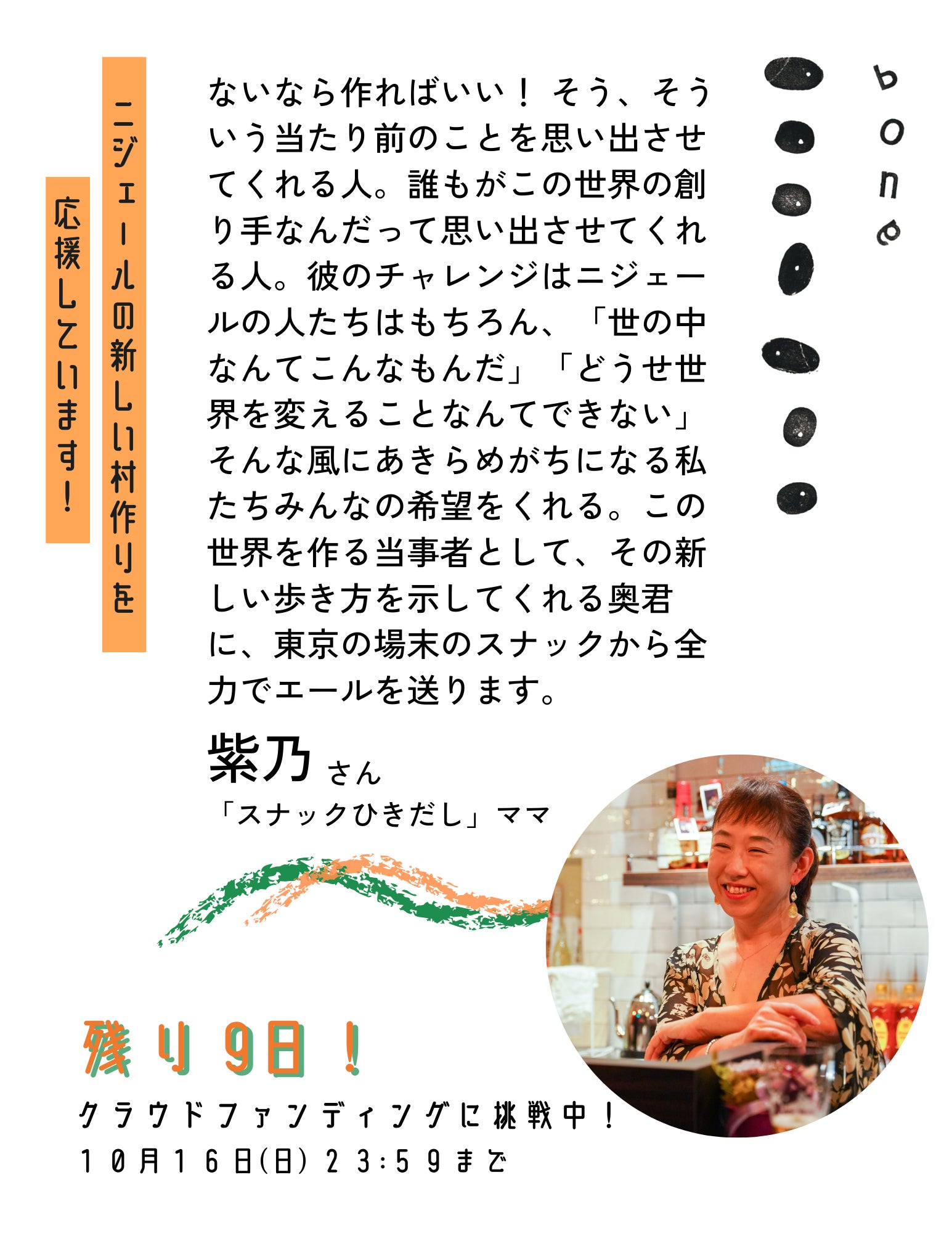 2人目は、スナック「ひきだし」でママをされている、しのさんこと木下紫乃さんから応援メッセージを頂戴しました。