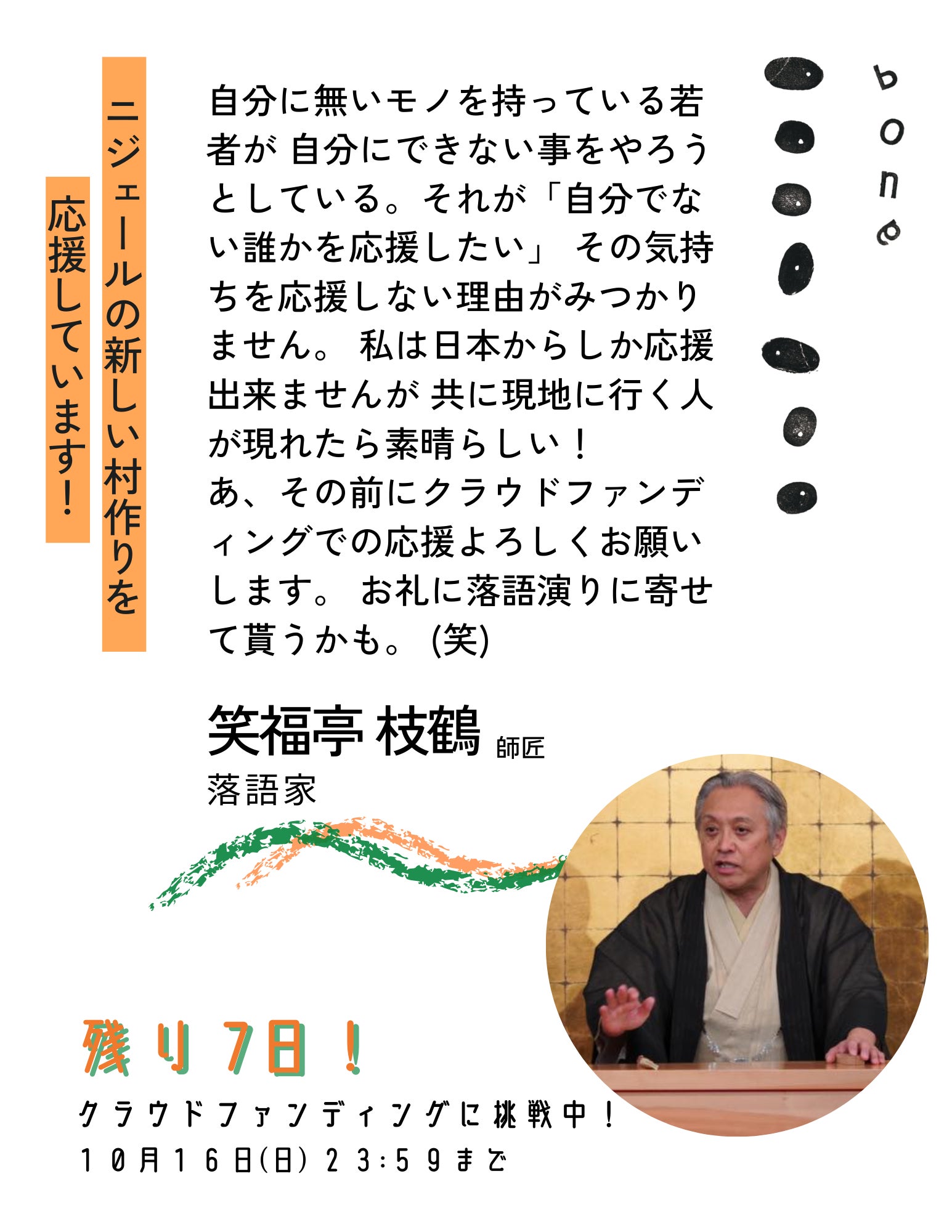 2年前には、岡山の倉敷で行われた「円陣全開!」という会にてアフリカ布で出来た浴衣を使って「密輸亭 阿弗利加」としてアフリカの話をさせていただいたりしました。そこでのお金を全額「アフリカの為に使いなさい」と言われたのには、本当に痺れました。そんな枝鶴師匠からのメッセージも本当に有難く、掲載させていただきます。