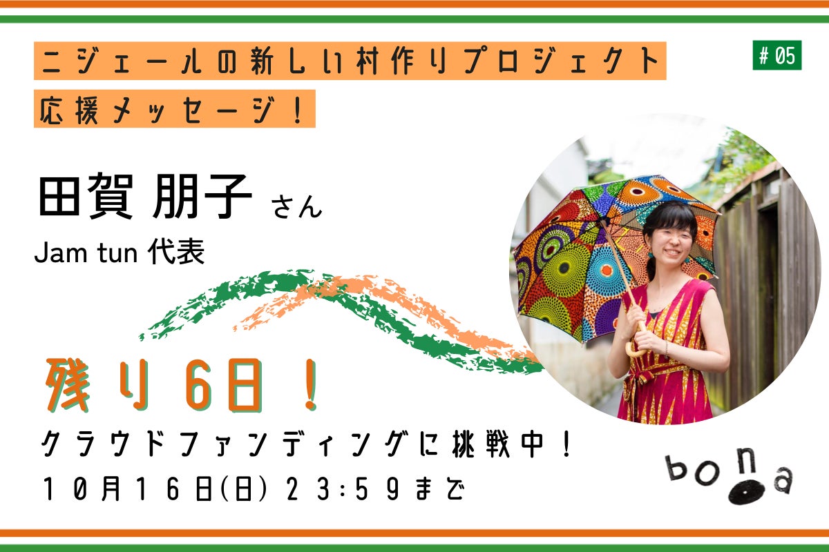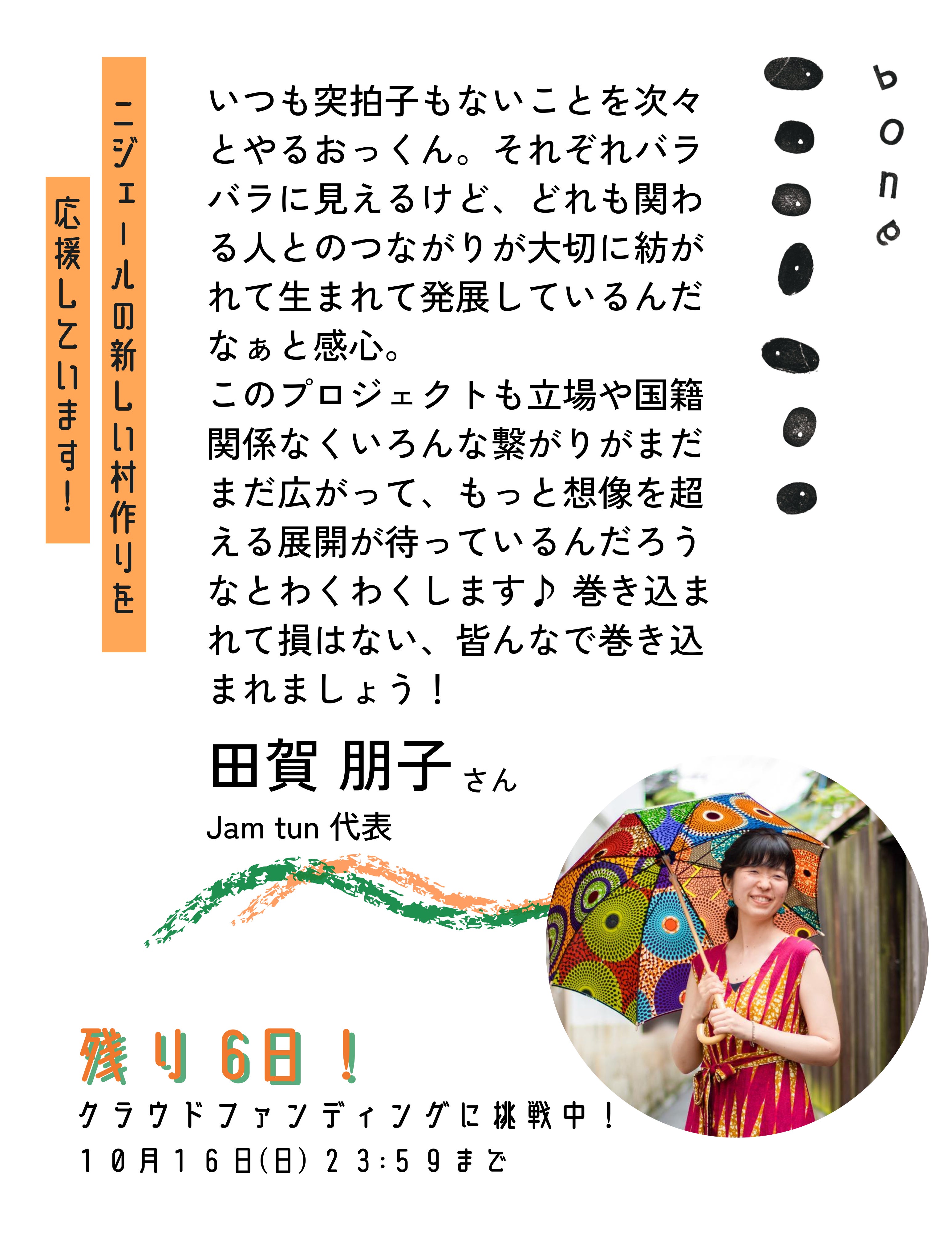 今回、Tシャツを一緒に開発したJam tun代表の田賀 朋子さんから応援メッセージを頂戴しました。