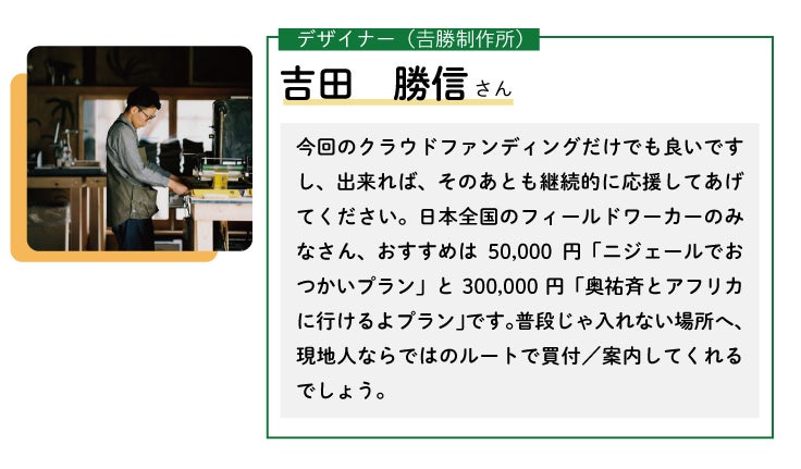 クラウドファンディングを実施するにあたり、「ただ支援していただくだけでなく、リターンで喜んでいただき、このクラウドファンディングの後にも継続して販売(5%〜10%を寄付する)ことによって、村の教育などへ支援を続けられるような商品」も開発しました。