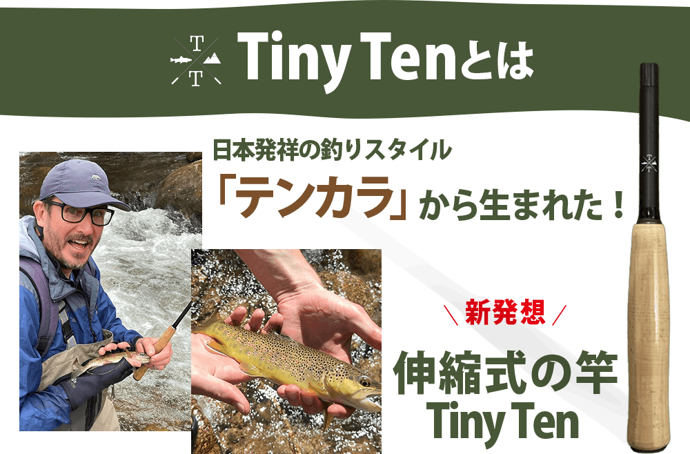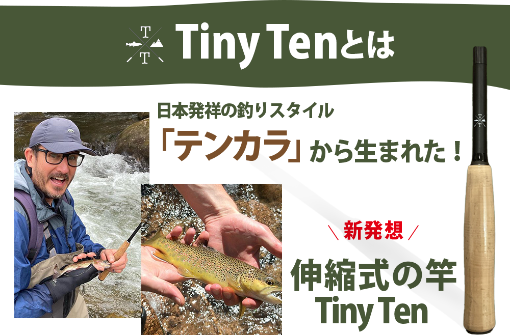 そんな中、コロラドの青年サミュエル・ケイトがTiny Tenを制作しました。日本古来の釣法「テンカラ」で使う竿が、米国でリデザインされたのです。弊社はこの商品を今後老若男女問わず多くの方々にご紹介してまいります。