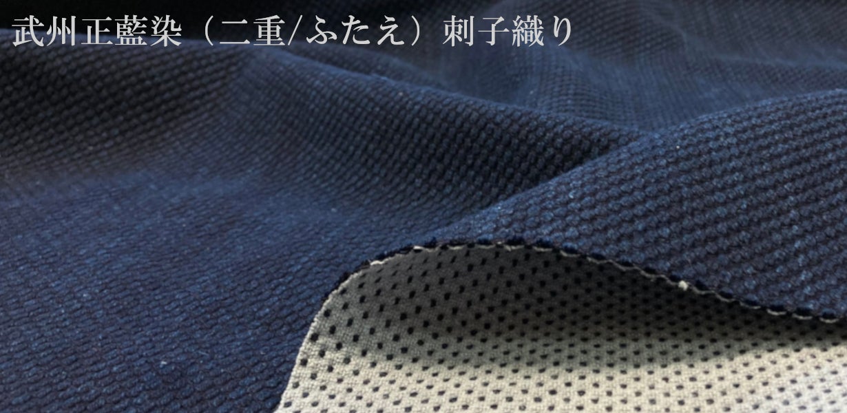 今回の雪駄に使用する生地は、ブランド藍染である武州正藍染刺子(ぶしゅうしょうあいぞめさしこ)の二重(ふたえ)生地を使用しております。