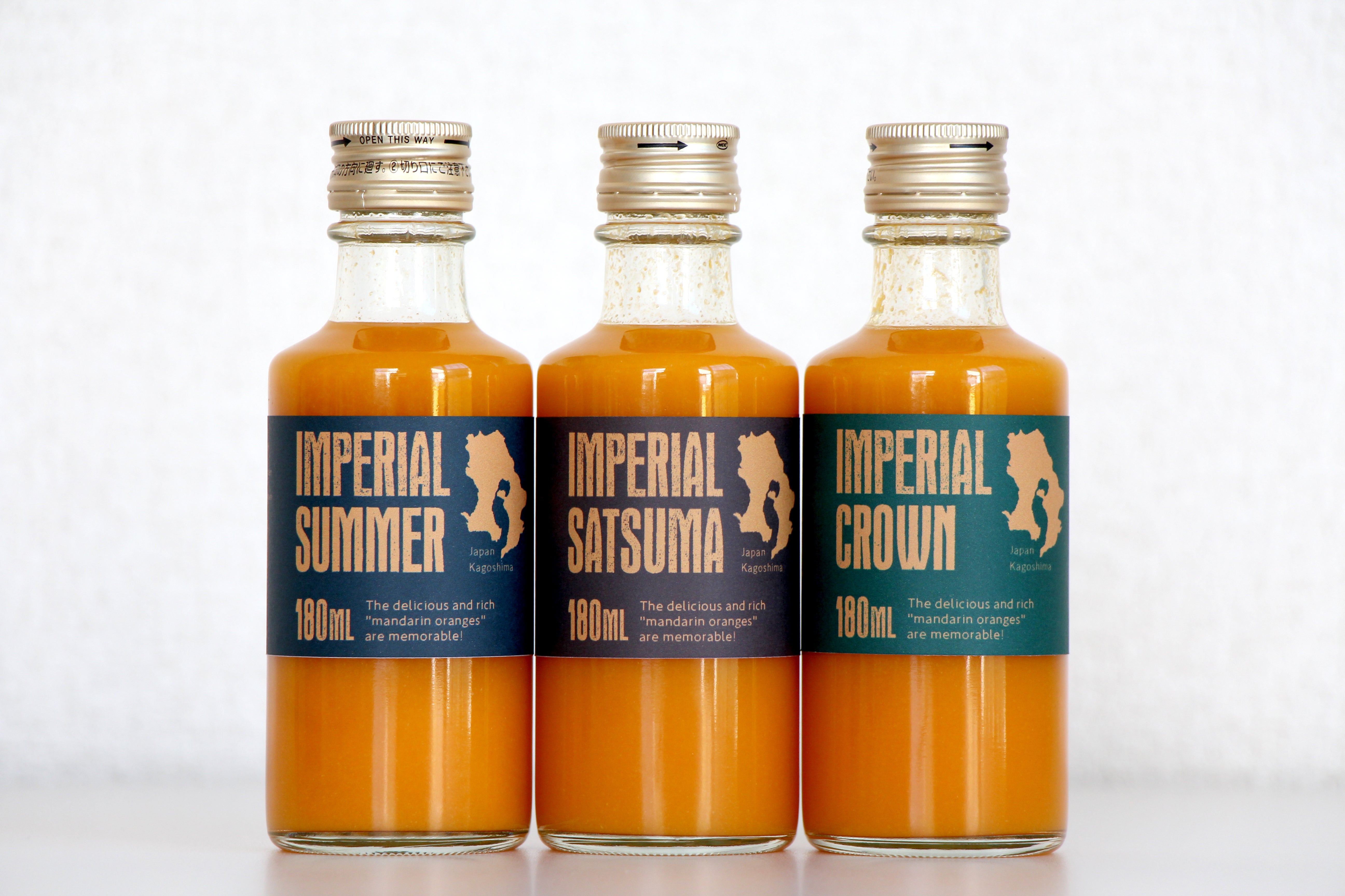 IMPERIALシリーズのラベルデザイン確定しました!IMPERIAL SATSUMAIMPERIAL CROWNIMPERIAL SUMMERこちらのデザインが確定しました!鹿児島の伝統色である消炭色(SATSUMA)、千歳緑(CROWN)、藍大島色(SUMMER)がイメージカラーとして採用してあります。伝統を取り入れつつも進化を求め、これからの新しい農業技術の発展にも努めて参ります!※イメージ画像のため中身は全て温州みかんの果汁です。