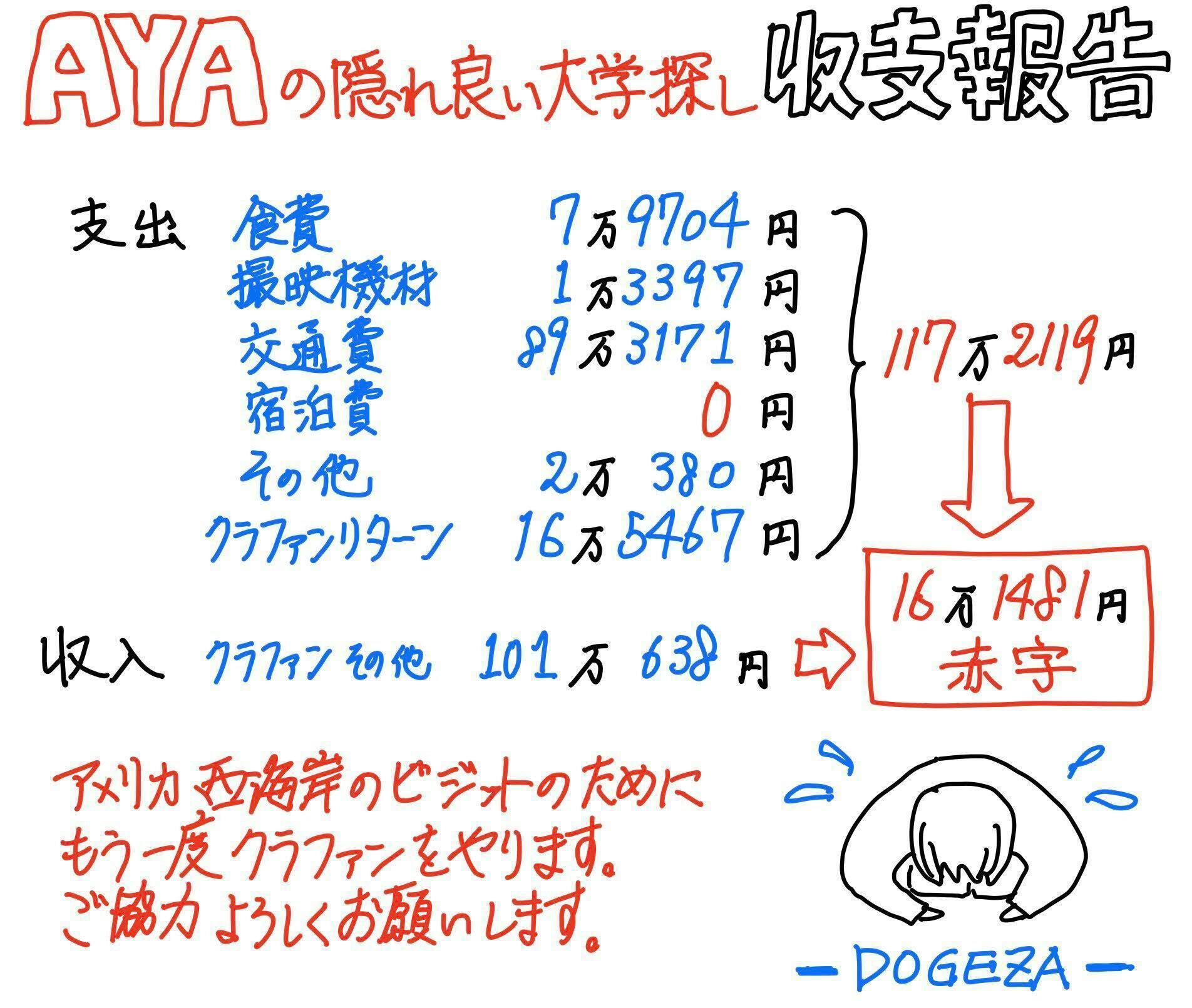 2023/01/07 19:29みなさん、お久しぶりです!AYAです!あけましておめでとうございます!昨年はクラウドファンディングでのたくさんのご支援、本当にありがとうございました!プロジェクトの公約といたしました英米の大学ビジットの第1弾を無事に終えたので、ひとまずの収支報告をさせていただきます(詳細は上の画像)。イギリスとアメリカの東海岸・中西部の全37大学を53日かけて巡った今回の旅。みなさんのご支援のおかげで無事に完遂し帰ってくることができました!リターンも、一部の大学のおみやげを除いて、全てお届けが完了しております。ただ、結論として、10月頃の急激な円安と、私が田舎にある良い大学を果敢に責め過ぎたせいで交通費が膨らんだことが原因で、約16万円の赤字となってしまいました。。。しかし!受験生や保護者の方々に感謝の声を沢山いただき、私自身も色々な「隠れ良い大学」を巡る中で、この旅の意義を感じる場面が多々ありました。私の Twitter や Instagram ではビジットした大学の取材報告も開始しており、少しずつ少しずつ、今まで知らないというだけでスルーされていた「隠れ良い大学」たちが日本に広まっているのを実感しております。そこで、2月にアメリカ西海岸の10大学を巡り、隠れ良い大学探しを完遂するために、1月中旬にもう1度クラウドファンディングをやろうと考えています。海外大の多種多様な魅力を取材して、もっと自由で幅広い進路選択を日本に届けられるよう、もしよろしければまた力を貸していただけたら嬉しいです。新年早々お願い事で大変恐縮ですが、今年もどうぞよろしくお願いします。以下は、今回ビジットした大学のリストです(訪れた順)。・グリネル大学・カールトン大学・デポー大学・ノックス大学・レイク・フォレスト大学・ノースウェスタン大学・シカゴ大学・ユニオン大学・ウィリアムズ大学・アムハースト大学・スミス大学・マウント・ホリヨーク大学・ブラウン大学・ウェズリアン大学・バーナード大学・コロンビア大学・ペンシルバニア大学・ハバフォード大学・スワスモア大学・ジョンズ・ホプキンス大学・ジョージア工科大学・ミドルベリー大学・ダートマス大学・ハーバード大学・ボストン大学・マサチューセッツ工科大学・ウェルズリー大学・キングス・カレッジ・エディンバラ大学・UCL・LSE・ハミルトン大学・コーネル大学・アーラム大学・ウースター大学・ミシガン大学・イリノイ大学 もっと見る